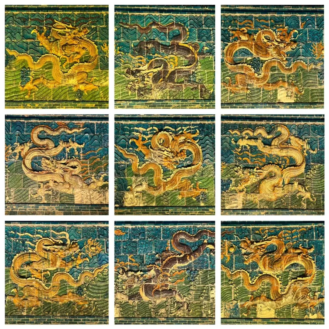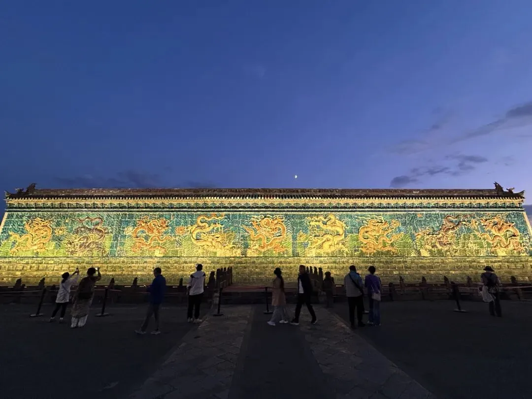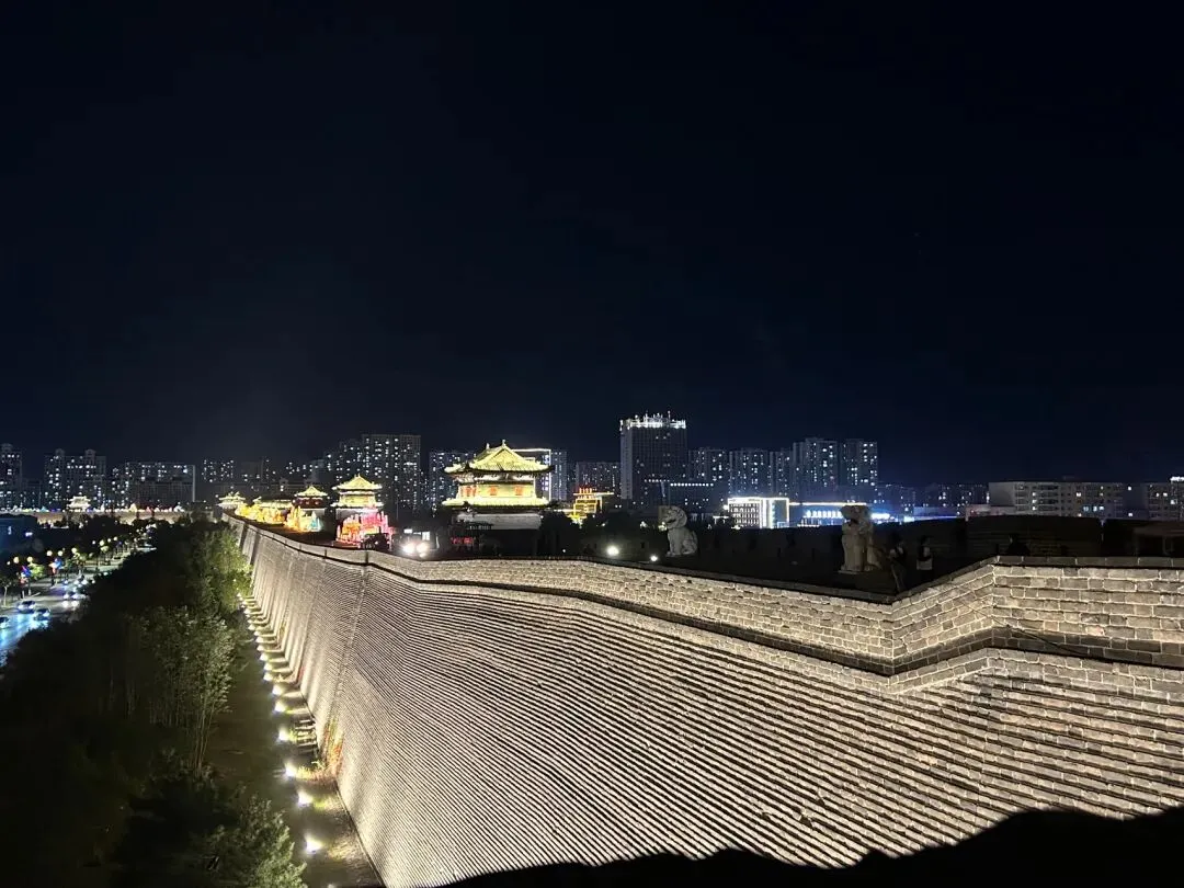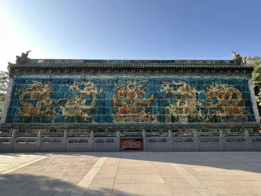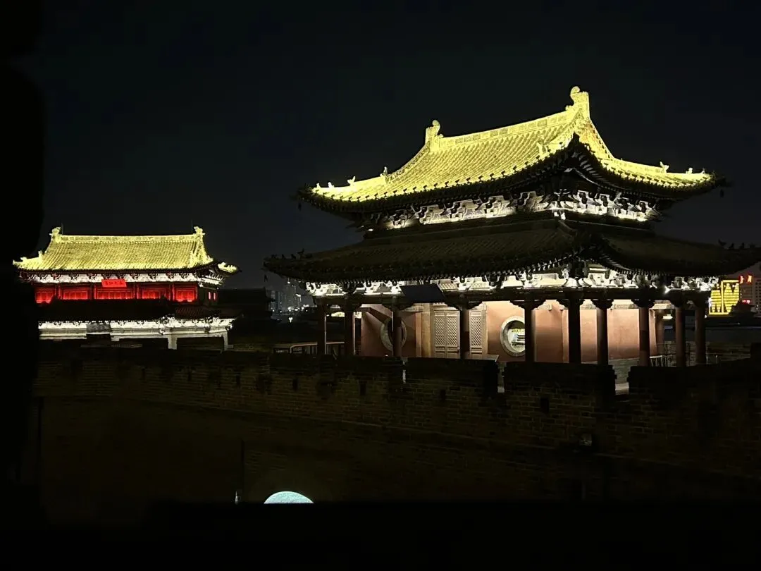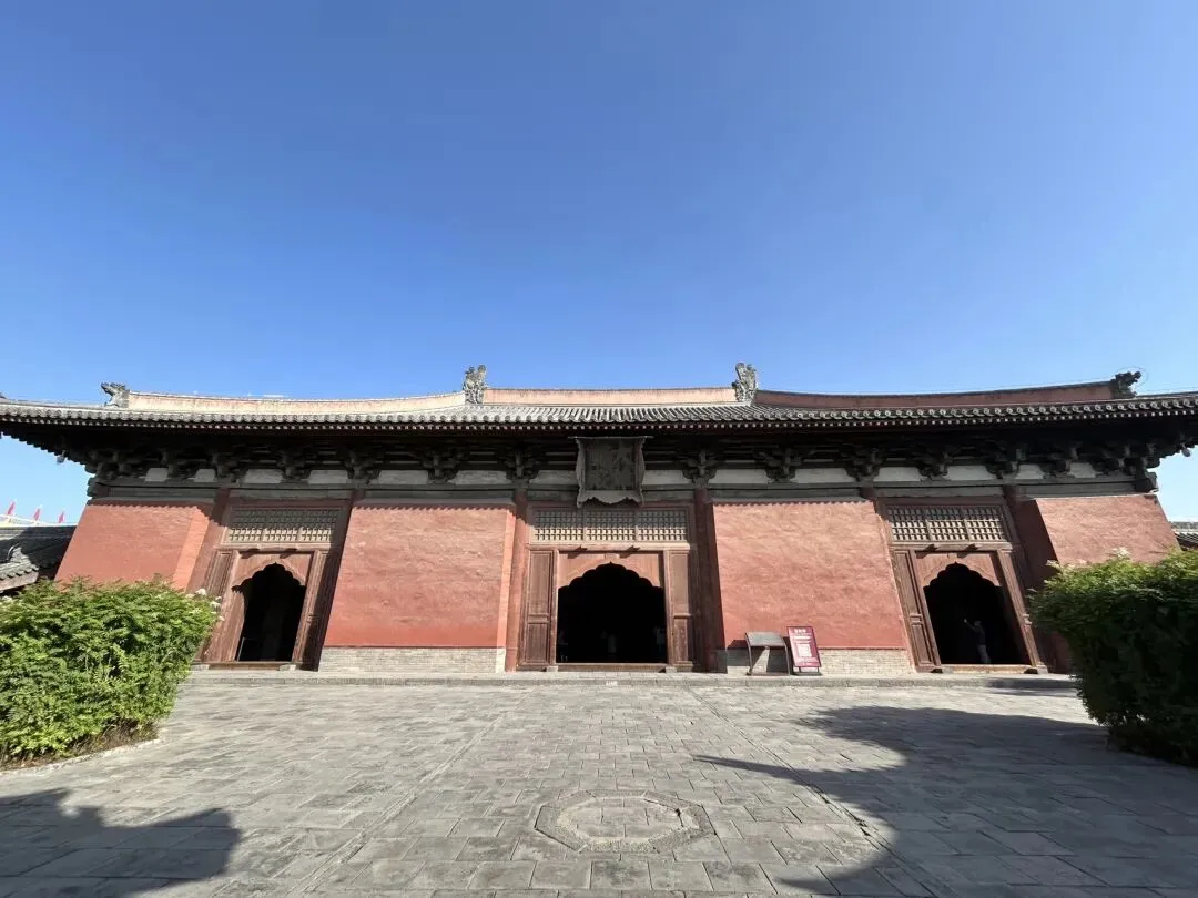 穿过天王殿,就来到了三圣殿。先在殿外看看金代的木构。那巨大的、形似莲花的斗拱,是金代特色的补间斗拱,也可以称为“莲花斗拱”,其装饰功能大于结构功能。看起来也很像一颗颗硕大的松果。在入殿看看明代彩塑。三圣殿内供奉的是华严三圣,中间为毗卢遮那佛,左边文殊,右边普贤。三圣殿过后,就是八大辽构之一,善化寺大雄宝殿。面阔七间,进深五间,跟华严寺的大雄宝殿一样采用了壶门形制的殿门。殿内供奉的是五方佛,最中央为毗卢遮那佛,另外四尊为东方阿閦佛、南方宝生佛、西方阿弥陀佛和北方不空成就佛。毗卢遮那佛两侧立迦叶、阿难二弟子。殿内两侧立二十四诸天,在华严寺大雄宝殿内为二十诸天。起初仅有16诸天,后来扩充到20诸天,佛教传入中国后,再加入了4诸天变为24诸天,明朝时期24诸天的人物构成也因本土化发展发生了变化。善化寺大雄宝殿内的二十四诸天让我震撼的点在于好真实,让人错以为他们就是真实存在的人物,彩塑如同兵马俑按照真人一比一复制。比如这尊功德天,站在她面前,让人根本无法忽视那充满慈悲的眼神。五方佛和二十四诸天一共33尊金代彩塑,构成了宏伟壮观、体系完整的神佛世界。大同古城内除了华严寺和善化寺,还有很多值得一看的。古城的正中心是四牌楼,站在四牌楼内,向北望看到的是魁星楼,向东望看到的是太平楼,向西望看到的是钟楼,向南望看到的是鼓楼。离四牌楼不远的地方,有一九龙壁,虽然隔着栅栏也能看到,但我还是花了10块钱进去参考,约等于一条龙一块钱而已。九龙壁是朱元璋第十三子代王朱桂府前的照壁,也是代王府唯一遗存,现在看到的代王府是现代修建。最中间的主龙不是以坐龙为中心且为四爪,而故宫内的九龙壁主龙为五爪坐龙,说明代王府等级低于皇宫,确实阶级等级森严。除了最中间的主龙,另外八条都是成对的,并且九条龙都结合了易经中的乾卦,隐含寓意。这个五龙壁原兴国寺山门照壁,后迁至善化寺。这里的主龙就是坐龙,但也是四爪,等级也是低于皇宫。夜幕降临,也可以登上大同古城的城墙,看看大同古城内的夜景。但建议淡季还是要有人同行,尤其是怕黑人士。