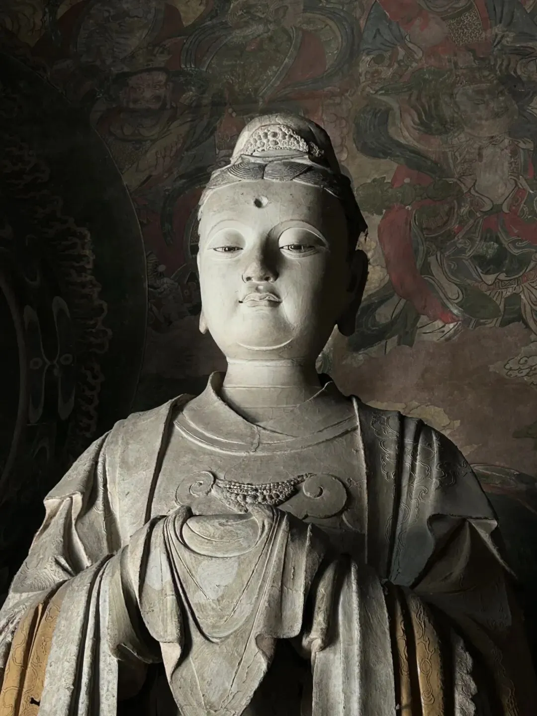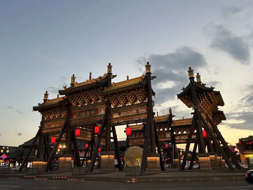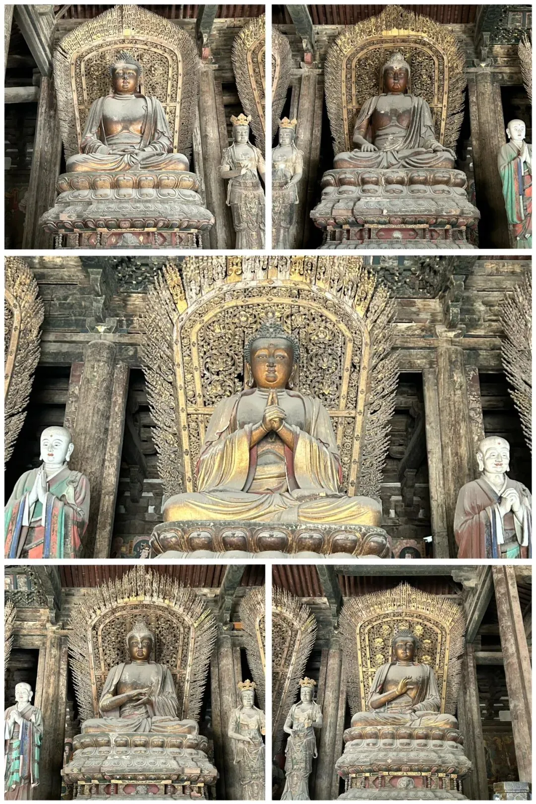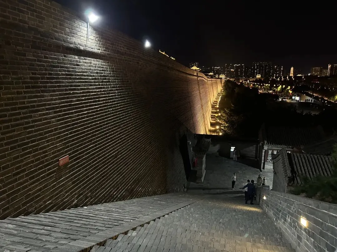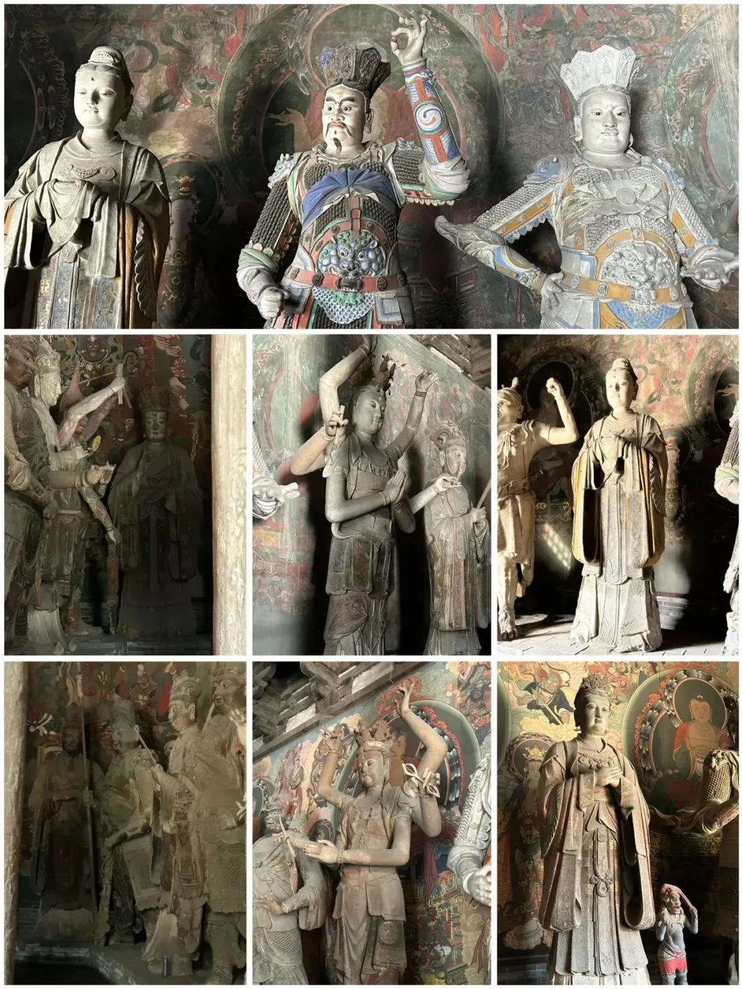 穿过天王殿,就来到了三圣殿。先在殿外看看金代的木构。那巨大的、形似莲花的斗拱,是金代特色的补间斗拱,也可以称为“莲花斗拱”,其装饰功能大于结构功能。看起来也很像一颗颗硕大的松果。在入殿看看明代彩塑。三圣殿内供奉的是华严三圣,中间为毗卢遮那佛,左边文殊,右边普贤。三圣殿过后,就是八大辽构之一,善化寺大雄宝殿。面阔七间,进深五间,跟华严寺的大雄宝殿一样采用了壶门形制的殿门。殿内供奉的是五方佛,最中央为毗卢遮那佛,另外四尊为东方阿閦佛、南方宝生佛、西方阿弥陀佛和北方不空成就佛。毗卢遮那佛两侧立迦叶、阿难二弟子。殿内两侧立二十四诸天,在华严寺大雄宝殿内为二十诸天。起初仅有16诸天,后来扩充到20诸天,佛教传入中国后,再加入了4诸天变为24诸天,明朝时期24诸天的人物构成也因本土化发展发生了变化。善化寺大雄宝殿内的二十四诸天让我震撼的点在于好真实,让人错以为他们就是真实存在的人物,彩塑如同兵马俑按照真人一比一复制。比如这尊功德天,站在她面前,让人根本无法忽视那充满慈悲的眼神。五方佛和二十四诸天一共33尊金代彩塑,构成了宏伟壮观、体系完整的神佛世界。大同古城内除了华严寺和善化寺,还有很多值得一看的。古城的正中心是四牌楼,站在四牌楼内,向北望看到的是魁星楼,向东望看到的是太平楼,向西望看到的是钟楼,向南望看到的是鼓楼。离四牌楼不远的地方,有一九龙壁,虽然隔着栅栏也能看到,但我还是花了10块钱进去参考,约等于一条龙一块钱而已。九龙壁是朱元璋第十三子代王朱桂府前的照壁,也是代王府唯一遗存,现在看到的代王府是现代修建。最中间的主龙不是以坐龙为中心且为四爪,而故宫内的九龙壁主龙为五爪坐龙,说明代王府等级低于皇宫,确实阶级等级森严。除了最中间的主龙,另外八条都是成对的,并且九条龙都结合了易经中的乾卦,隐含寓意。这个五龙壁原兴国寺山门照壁,后迁至善化寺。这里的主龙就是坐龙,但也是四爪,等级也是低于皇宫。夜幕降临,也可以登上大同古城的城墙,看看大同古城内的夜景。但建议淡季还是要有人同行,尤其是怕黑人士。