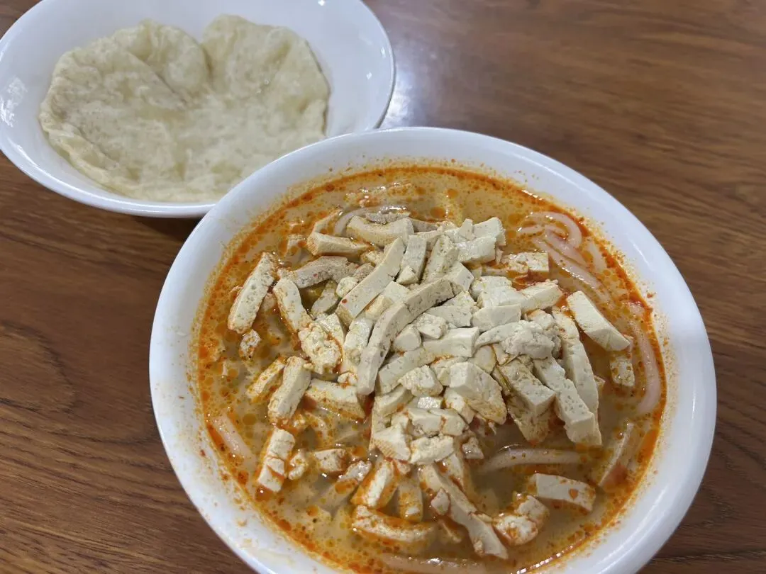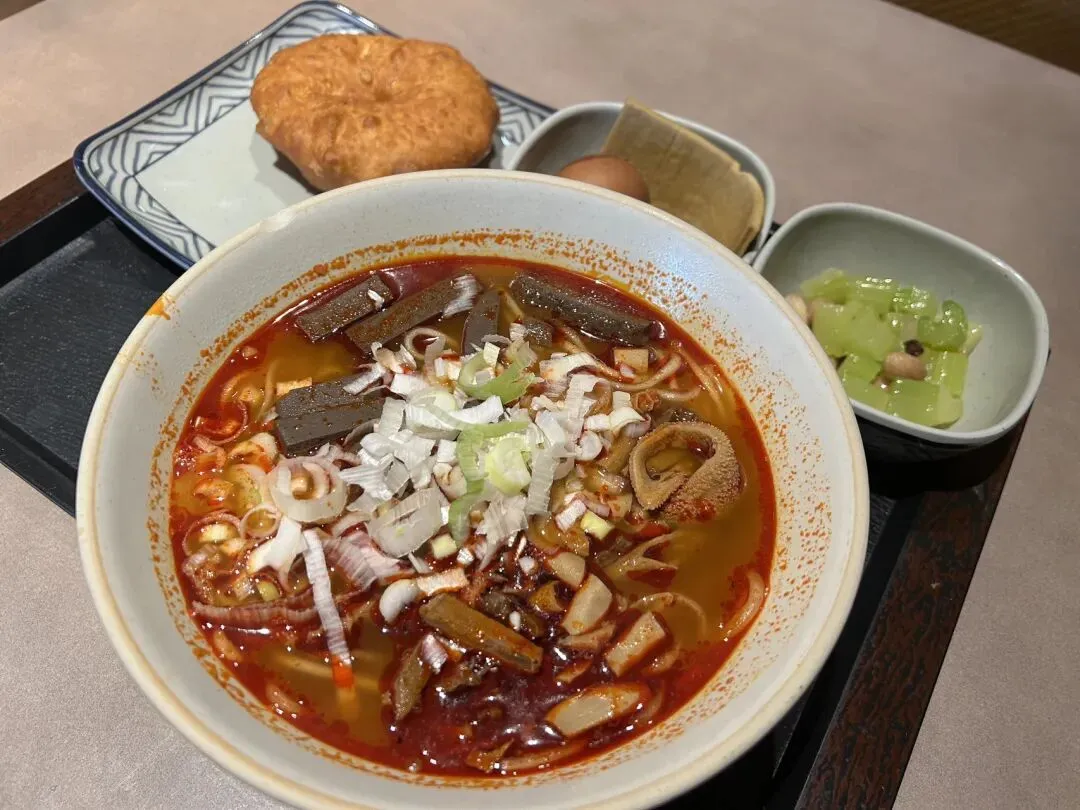 当时游客很少,城墙上只有一只手能数得过来的人。当我从城墙下来,准备打车回家的时候,发现我需要穿过漆黑的翁城,而且一个人都没有,突然感到害怕,那些恐怖片里的剧情快速闪过,不管了直接冲,冲出翁城,发现居然还有月城。月城也是漆黑一片,仅有几个红灯笼,更吓人的是还有一戏台,中式恐怖氛围感一瞬间就上来了,我马上冲刺出城,简直不要太刺激。在善化寺旁有一羊杂粉,叫峭壁羊倌。我点了一个羊杂粉套餐(有茶叶蛋和卤豆皮)+一个油饼,金额20多,具体不记得了。但我记得油饼1.5块钱一个。我会记得那么清楚的原因是:那天我一大早就到了善化寺,为了第一波进去,游客会少一点。到了善化寺,发现还没开门,就在旁边的这家峭壁羊倌先吃个早餐。我点完单之后,有几个环卫工人陆续进来吃早饭,其中有一大爷,只要了3个油饼。这家店提供免费的小米粥和小菜,自取不限量,所以环卫大爷只用花4块5,油饼配上小米粥和小菜,就能吃得很饱以支撑他当天上午的工作。这家羊杂粉很好吃,配上油饼也很有滋味,但我全程一直都在想环卫大爷的事。也是因为这个事,我就觉得大同真的是一个很善的城市,以至于到现在我都还在回味大同的旅行。从善化寺出来,我又去吃了一家粉店,叫王老五豆腐粉。小碗豆腐粉6元,油饼5毛钱一张。做豆腐粉的是一位留着长胡子的大爷,油饼是给了钱之后自己去盆里夹,也不怕人多夹了。豆腐是碱水味很重的那种老豆腐,味道上无功无过但胜在物美价廉。