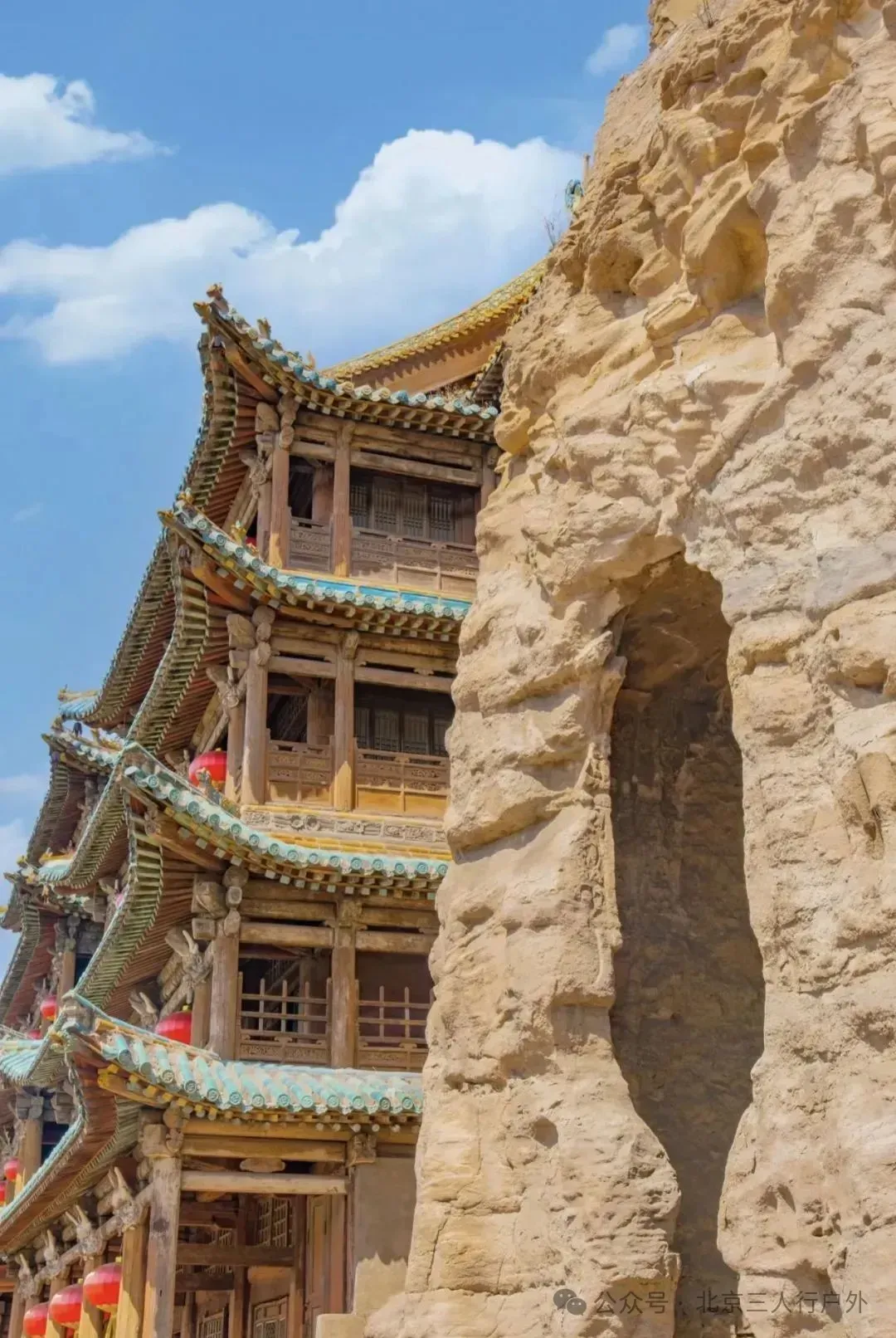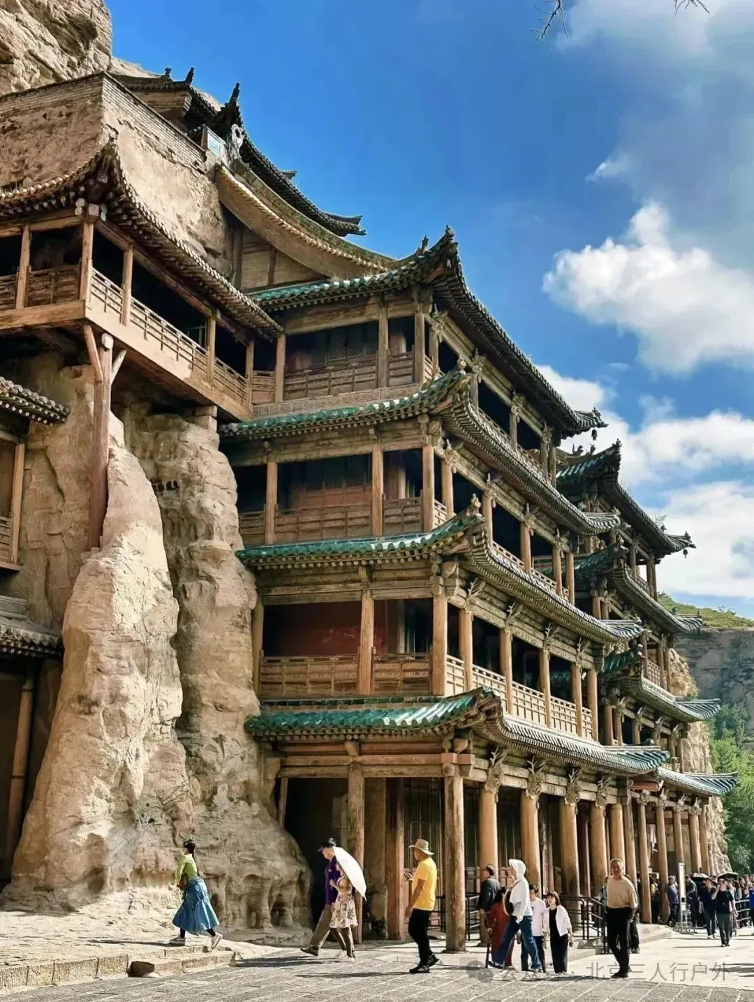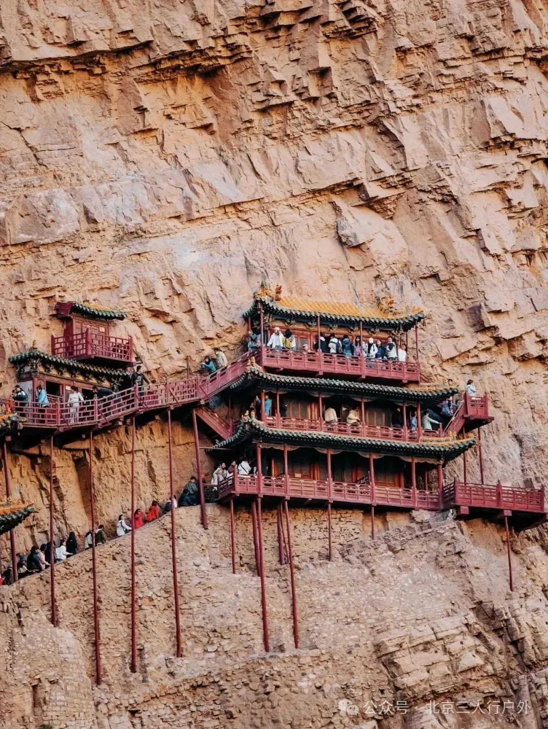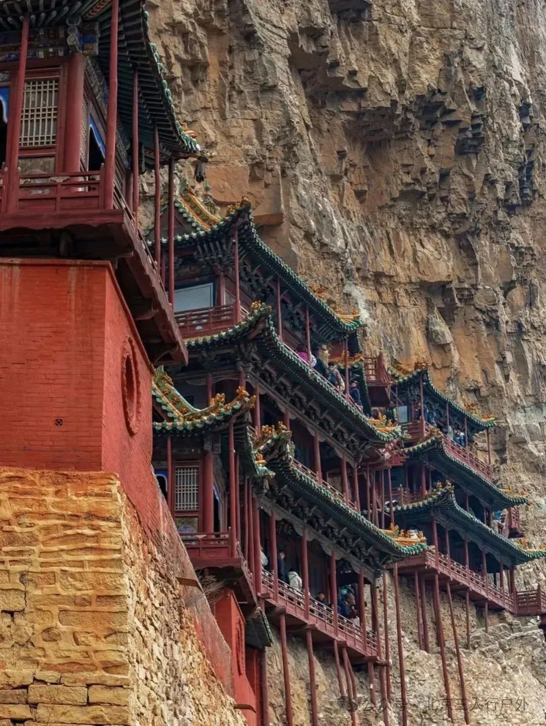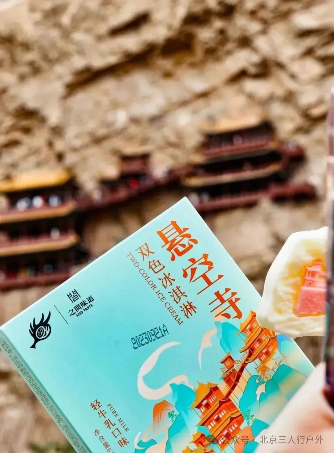 #悬空寺大同文创雪糕真的有点东西,“石屏千仞立,古寺半空悬,现存建筑是明清修缮的。登临要排队缓慢的向上,栈道很窄,上为木栈道,下为石栈道,属于全木质榫卯结构,并不是靠几十根木柱支撑,而是以插入岩壁的横梁为基础,同时与回廊栏杆上下梁柱形成框架式结构,这就是千年不倒的秘密,悬空寺木梯上的莲花图案,寓意"步步登莲,吉祥如意"也是古诗一绝,也是罕见的佛、道、儒三教合一的寺庙。