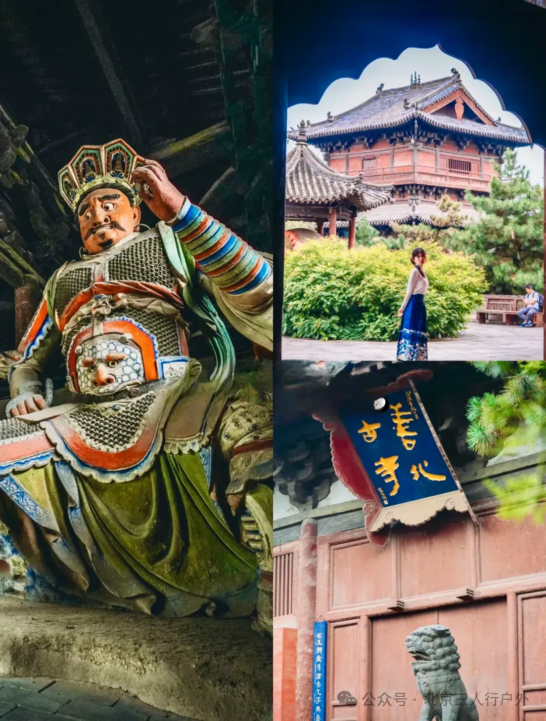 善化寺俗称南寺,大门是落成于金代初年的大型官式建筑,是现存最古老的金代建筑之一,更是我国屈指可数的殿堂式木构建筑,免门票,景区门口预约凭预约码进去即可,寺内主要参观为天王殿、三圣殿、大雄宝殿、普贤阁,◆大雄宝殿,辽金建筑,内有五方佛从东到西依次为东方阿閟佛、南方宝生佛、中央毗卢遮那佛、西方阿弥陀佛、北方不空成就佛。◆山门四大天王,在天王殿是明代塑像,天王的“表情包”太有意思了特别逗。