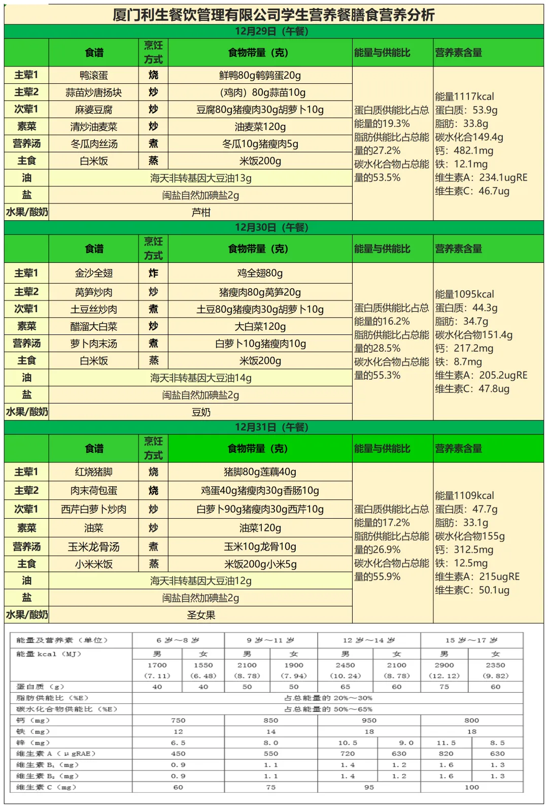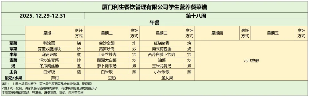 【营养健康】同安区大同小学2025年12月29日—12月31日食谱