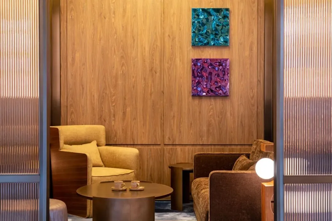 走进水晶酒店大门,微醺的旅程也就此开启了,整个大厅都是流动的琥珀色,清透而迷人,空气中弥漫的烟熏威士忌木质香更是令人上头,无处不在的六芒星元素配合着简约又不简单的设计,每一处都不单调。