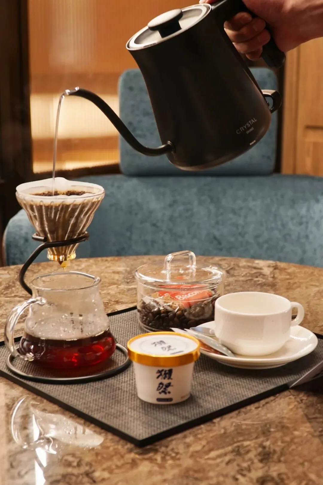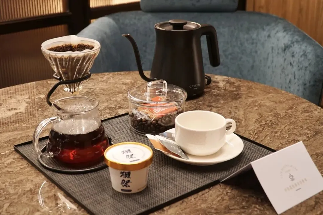 替大家尝了,确实有非常浓郁醇厚的酒糟香味,入口即化,不含酒精,却莫名的上头。不得不说的还有水晶酒店招牌的手冲咖啡,他们是采用“天花板级”的日晒耶加雪菲豆,虽然说耶加雪菲品种很常见,但是只有高端精品豆才能用作手冲咖啡,一口纯粹的手冲,可以品出柠檬花果香,和舌尖留下的冰淇淋甜交织在一起,绝了!