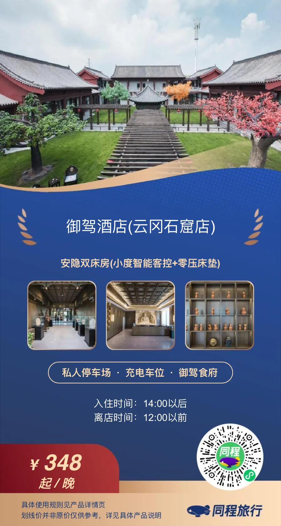 地利·禅缘深厚 咫尺佛国:步行仅5分钟,即可踏入世界文化遗产云冈石窟的恢弘画卷,让千年石刻艺术成为您静思的背景。 梵音萦绕:毗邻香火鼎盛的五爷庙与智慧象征的文殊殿,晨钟暮鼓间,浸润于悠远深厚的佛教文化氛围。 庭院·静心之境 酒店庭院精心构筑一方都市之外的宁静天地: 亭台楼阁:精巧的中式亭台点缀其间,是独坐冥思或品茗悟道的理想角落。 草木生趣:四时花草葱茏,绿意盎然,漫步小径,听风观叶,感受自然赋予的平和能量。一院之内,禅意流淌,是澄澈心神、对话自我的静心道场。 居所·禅居美学 多间禅意居所,以新中式风骨为魂,融东方智慧与现代舒适: 意境房型:从简约禅风的“安隐双床房”、“静心双床房”、“云水大床房”,到宽敞通透的“禅舍”、“揽云复式亲子房”,以及尊享的“禅悦套房”、“飞天稚趣家庭房”、“和合精舍套房”,命名皆蕴藏修行哲思。 通透禅景:全景落地大窗,将庭院四时美景框成天然水墨,静坐房中,亦能心游物外。 雅致匠心:温润实木家具沉淀时光质感,新中式设计演绎简约禅境。 静谧安眠:零压床垫承托身心疲惫,干湿分离卫浴空间洁净清爽,全屋智能系统便捷贴心,于细节处成就安然无忧的休憩体验。 于云冈佛光之下,居御驾禅院之中。酒店诚邀您暂放俗务,以庭院为蒲团,以石窟为经卷,开启一场身与心的深度对话,寻回内在的澄明与力量。此心安处,即是归途。广告