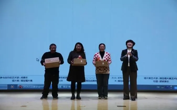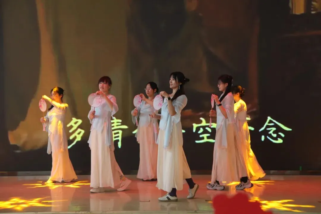 由初中部张春艳、张研、孟庆莲、石建斌等老师带来的创意歌舞剧《融艺彩——轻摇扇舞绽芳华》,为大家带来了截然不同的视听享受。节目巧妙融合了传统扇舞与现代编曲,教师们身着典雅服饰,手执彩扇,随着音乐翩然起舞。舞步时而轻柔婉约,时而明朗欢快,手中彩扇如蝶纷飞,如花绽放,在动静交替间绘出一幅绚烂多姿的画卷。节目不仅展现了初中部教师深厚的艺术素养与团队默契,更以“融艺彩”、“绽芳华”为主题,生动喻示了五中教育多元融合、师生共荣的蓬勃景象,赢得了全场阵阵赞叹与掌声。