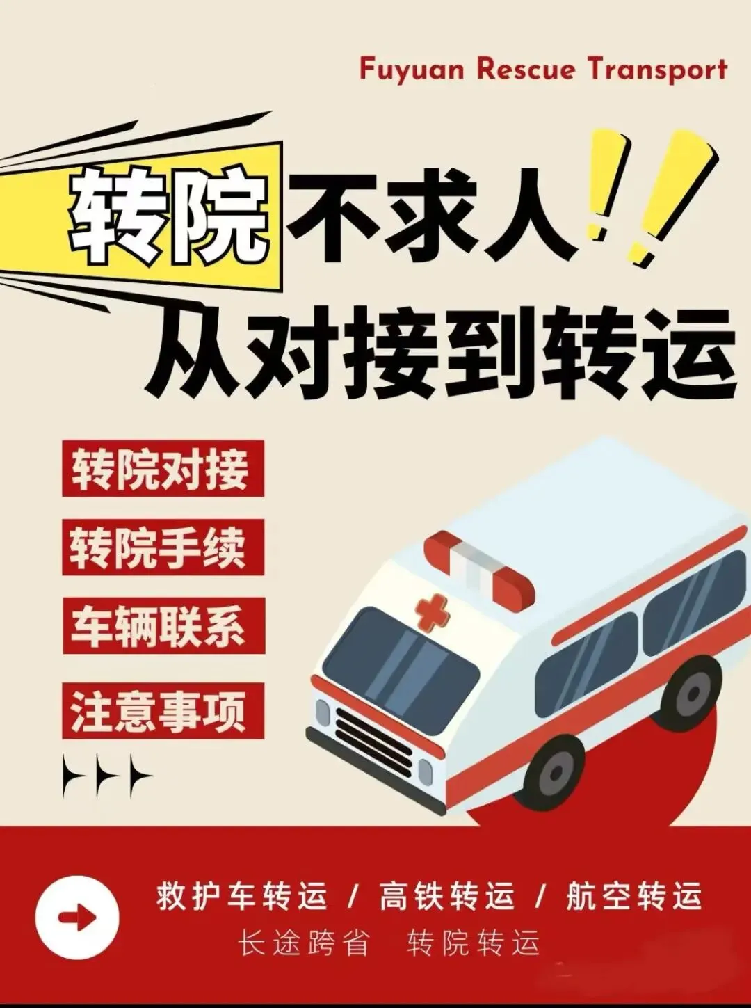 这些我们都可以做,我们是非急救救护车,专门干的就是长途跨省转运病人这件事情,我们家可以电话预约,最快15分钟出车,转运病人是我们的强项。不管您是出院还是转院,我们都可以做。