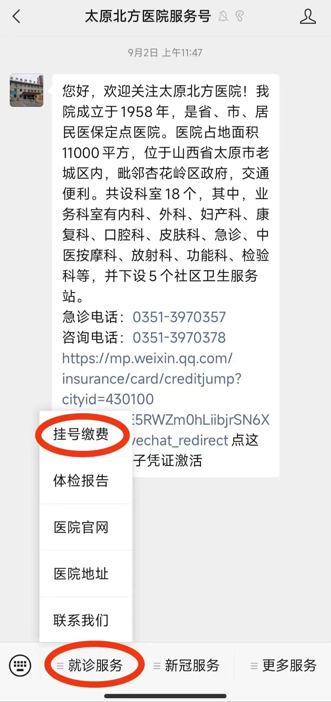 其次,在下方菜单栏中-最左侧选择【就诊服务】→【挂号缴费】即可直接线上实现挂号、缴费、查报告、住院充值、住院日清单查询、电子陪护证申请。