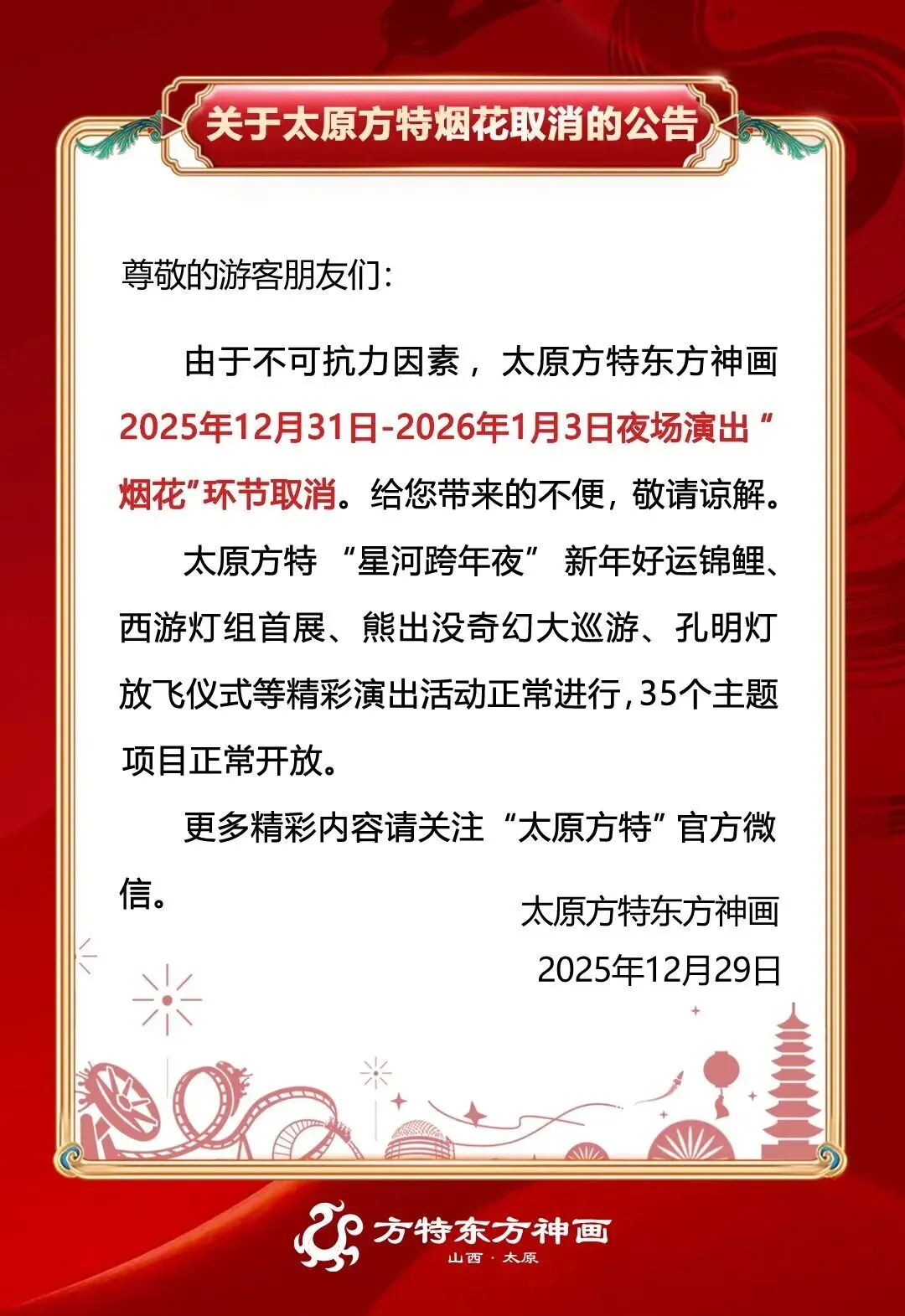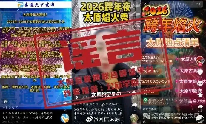 网传“太原多地将举办跨年焰火秀”为不实信息,方特烟花环节取消