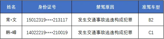 以下2名驾驶人因发生交通事故逃逸构成犯罪,被依法吊销机动车驾驶证,且终身不得重新取得机动车驾驶证。