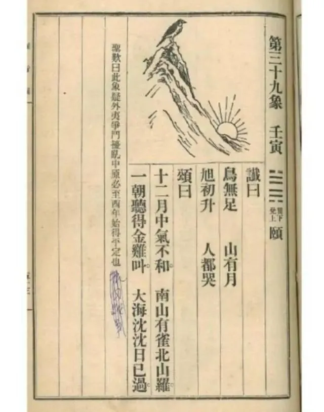 3、第39象,图中山巅站立一只鸟,山后旭日初升。