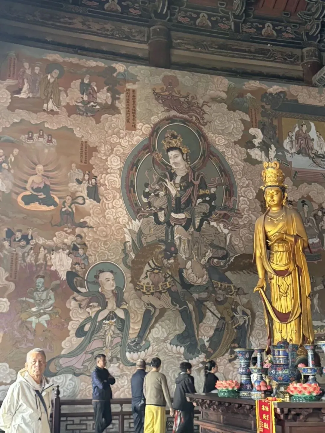 大雄宝殿的外墙是枣红色,不拘一格中蕴含着几分秀美。尽显金代建筑的风格。华严寺大雄宝殿位于山西大同华严寺内,是中国现存规模最大的辽金时期木构佛殿之一其始建于辽清宁八年(1062年),辽保大二年(1122年)毁于兵火,金天眷三年(1140年)在原址上重建,历代均有修缮。佛坛上供奉着明代重塑的五方佛,中间三尊为木雕,两侧两尊为泥塑,五方佛之间站立胁侍菩萨各一尊,共计六尊。殿内墙壁布满清光绪年间补绘的21幅巨型壁画,壁画高约6.5米,总长约137米,总面积为880.46平方米,共绘有五千多位人物。大雄宝殿开三扇大门。当心间上悬挂着两块牌匾,笔法苍劲有力,雄浑大气,令人震撼!还当我把视线转移到大殿顶端,就会看到两个巨大的鸱吻。