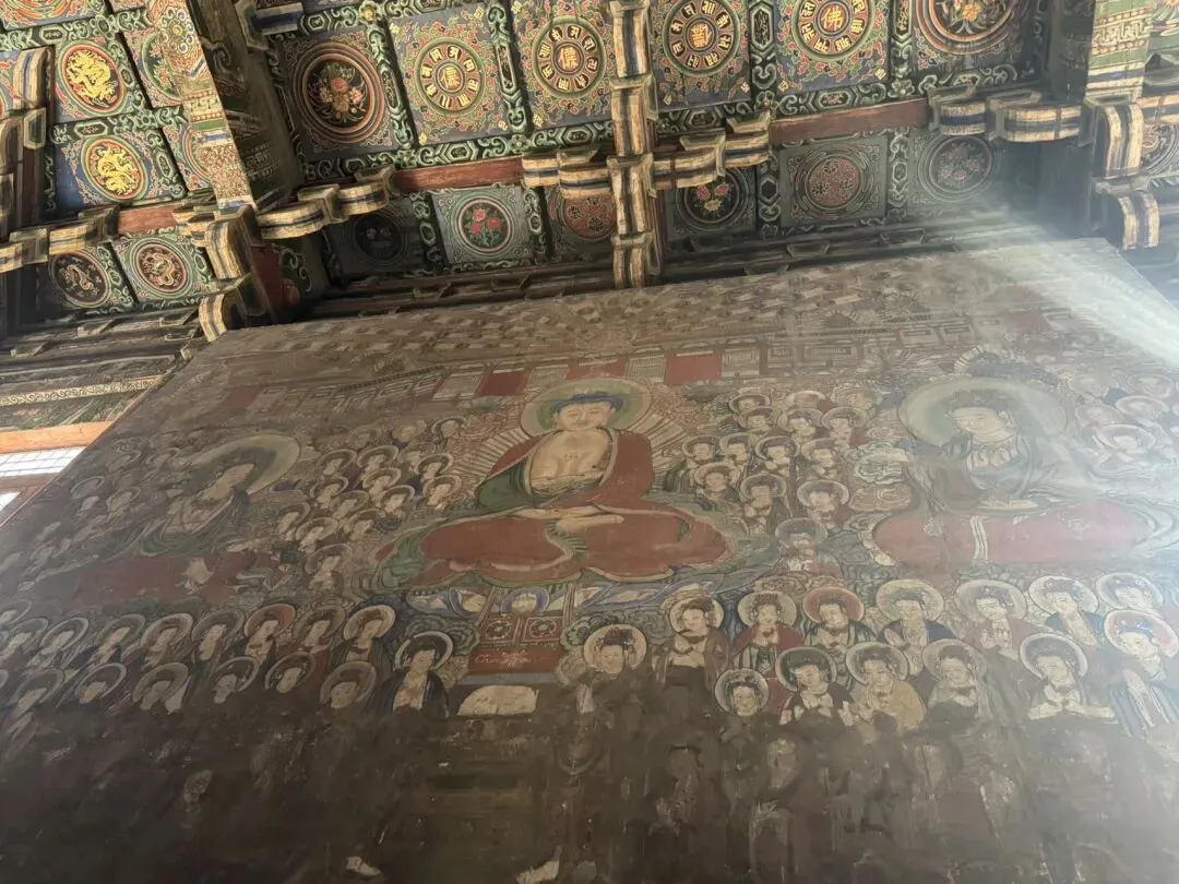 大雄宝殿的斗拱为六铺作。十分硕大,延承唐风,极富辽金特色。走进殿内,清代的巨幅壁画与明代的彩塑映入眼帘。大殿使用减柱造,但并非典型的殿堂式建筑。