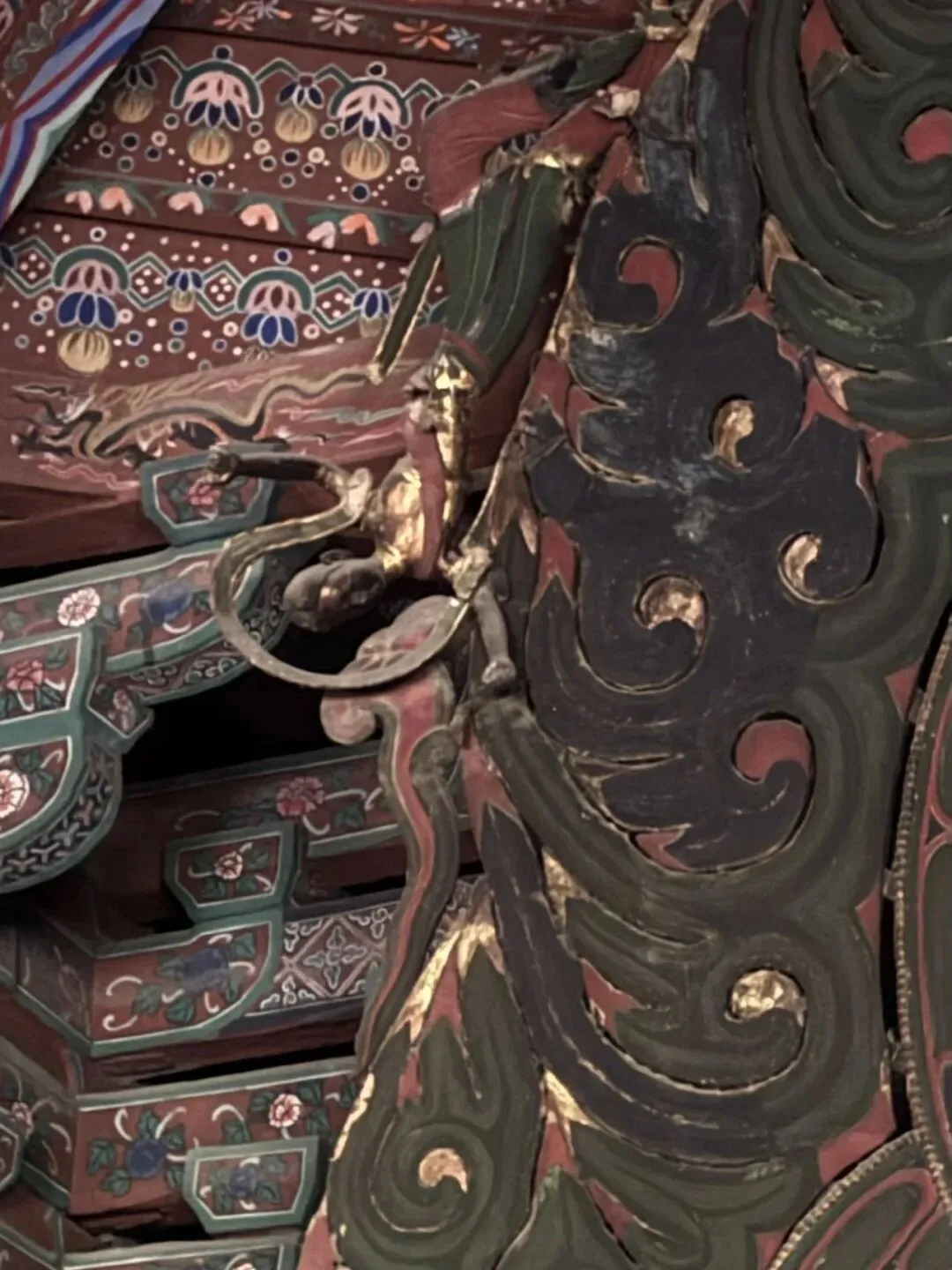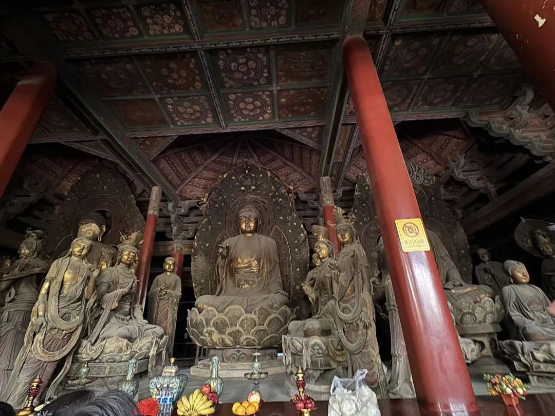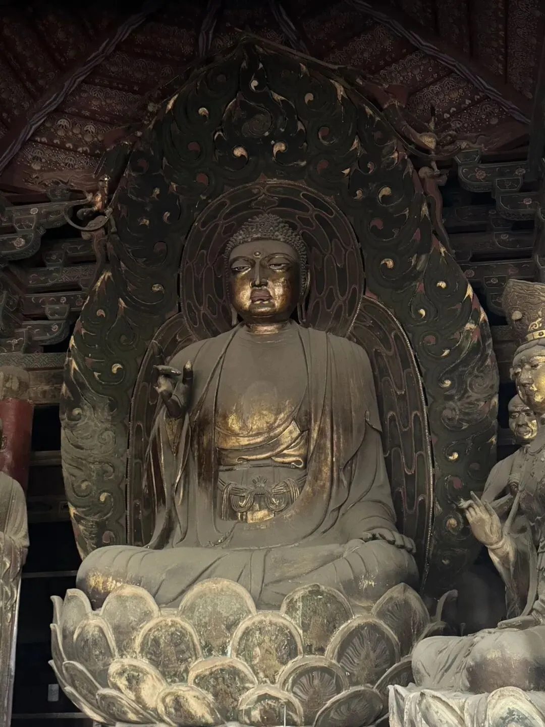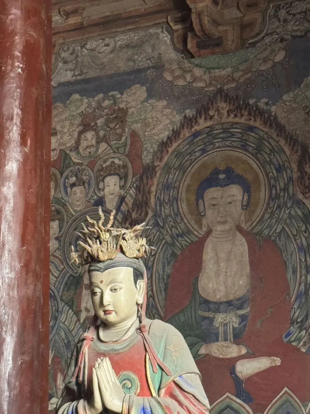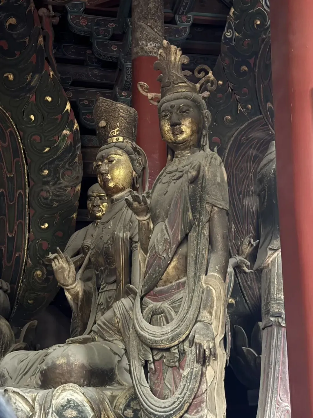 柱头的铺作如同莲花,不同于大雄宝殿的雄浑大气,更显秀气。怪不得铺作的量词会被叫做“朵”!走进殿内,一尊尊精美的辽代彩映入眼帘。他们不同于宋代的灵动,更显雍容、典雅,却又十分庄严、神圣!