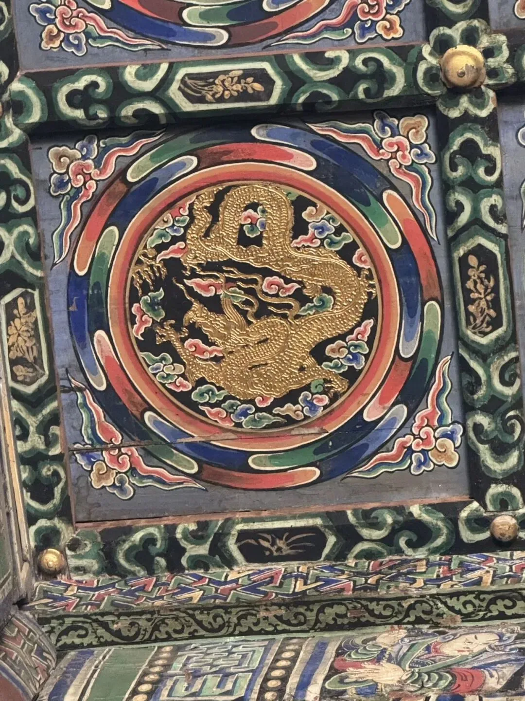 走到抱厦之下,抬头看,一座斗八藻井出现了,他犹如苍穹 十分大气,虽是仿建,但很古朴。