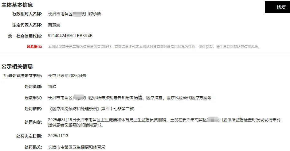 长治一诊所被罚!