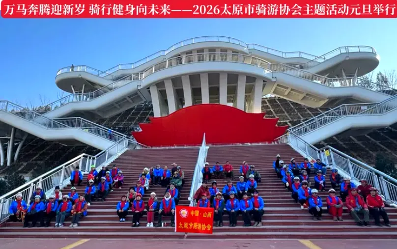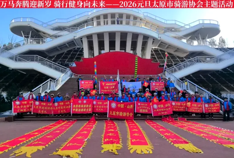 2026年1月1日清晨,太原胜利东街网红桥(天字桥)上红旗招展,晨光初露。太原市骑游协会“万马奔腾迎新年,骑行健身向未来”主题首骑活动在此启幕,一群身着统一蓝色骑行服、佩戴鲜红围巾的银龄志愿者,用活力骑行迎接新年第一缕曙光,为龙城太原的元旦增添了浓墨重彩的喜庆氛围。上午九点时分,活动由太原市骑游协会常务副会长李富生主持。会长茹太平发表新年贺词,向全体骑友送上诚挚祝福,寄语大家在新的一年里继续以车轮丈量美好,以骑行传递活力。太原骑协荣誉会长、山西环三晋自行车联赛王基福主席、太原骑协荣誉副会长捷安特和平北路店、下元店、优山美郡店胡强经理先后登台,带来饱含期许的新年祝福与寄语,为活动注入满满暖意。随着欢快的节奏响起,常务副会长马爱军引领舞龙队员上演“风火轮”绝技,彩龙穿梭舞动,点燃现场气氛。“新年快乐!”“新年好!”的嘹亮口号铿锵有力,回荡在网红桥上空,与远处的太原解放纪念碑相映成景,既有节日的欢腾,更有精神的传承 。仪式结束后,骑友们列队骑行下山,车轮滚滚间,不仅是健身之路的延续,更是银龄风采的生动展现。