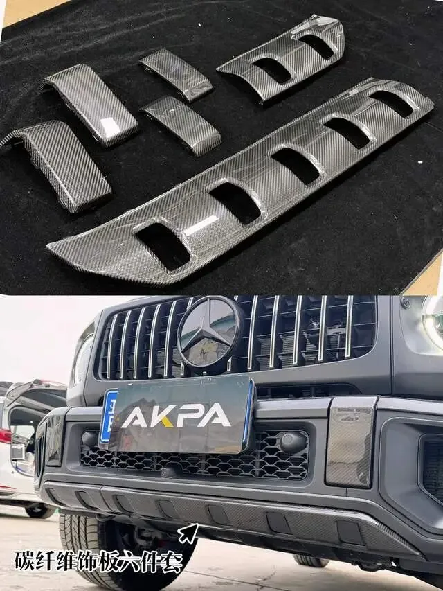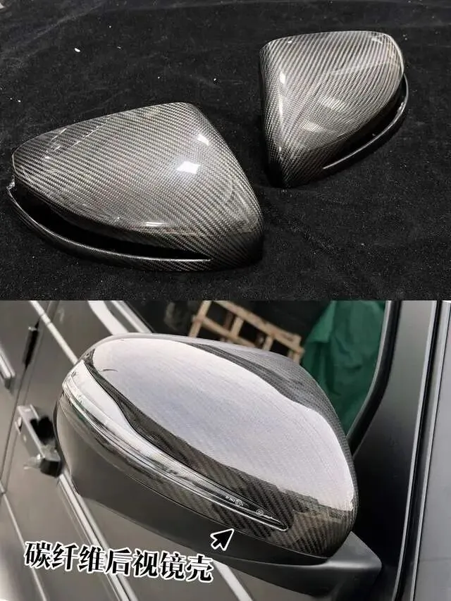 这台G63的升级重点之一是外观的全面碳纤维化。京车汇团队为其安装了真碳纤维前杠盖板、后杠盖板以及前杠护板两件套,这些部件不仅提升了视觉上的运动感,更有效减轻了车身重量。