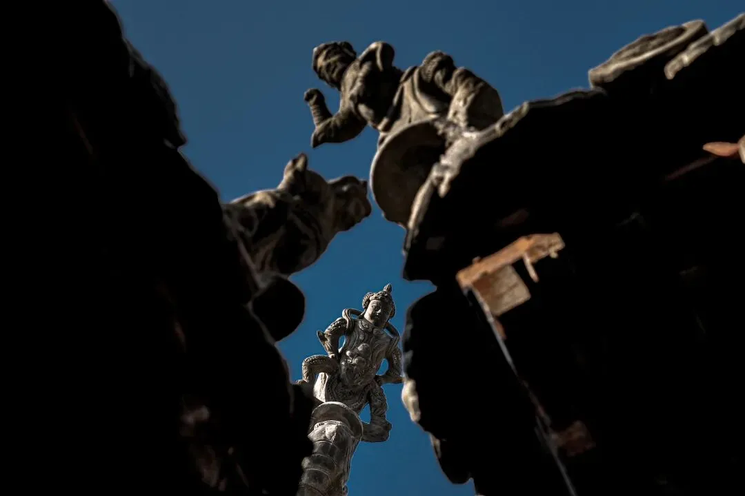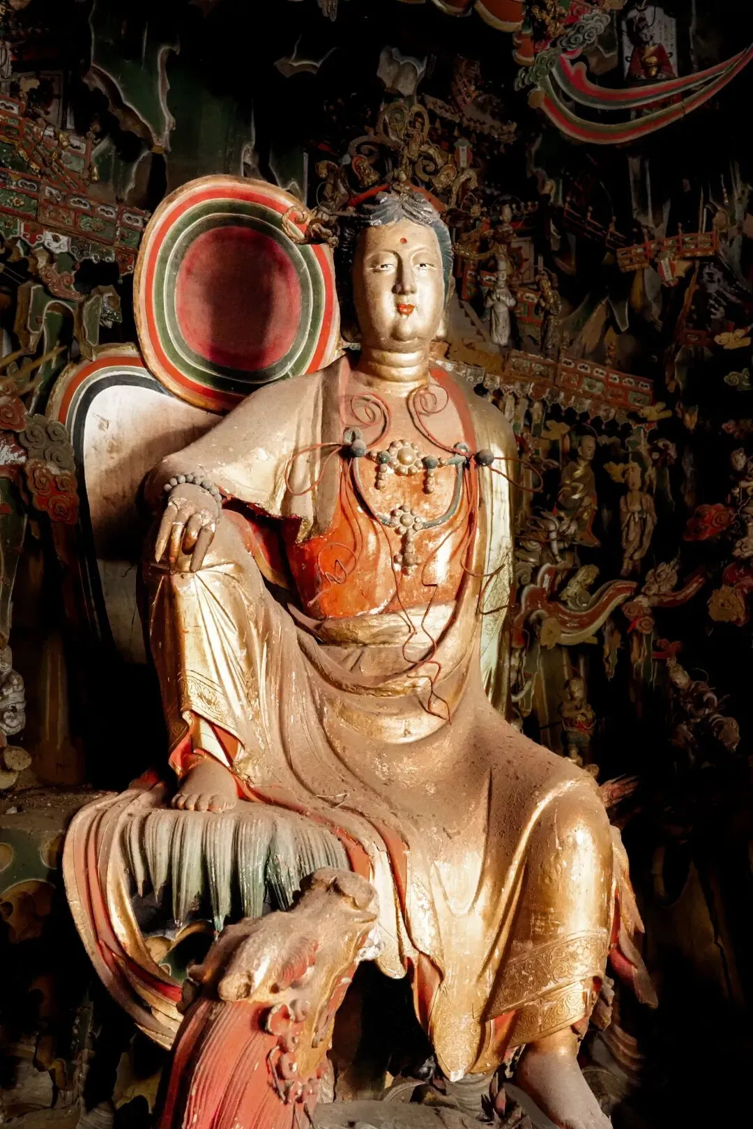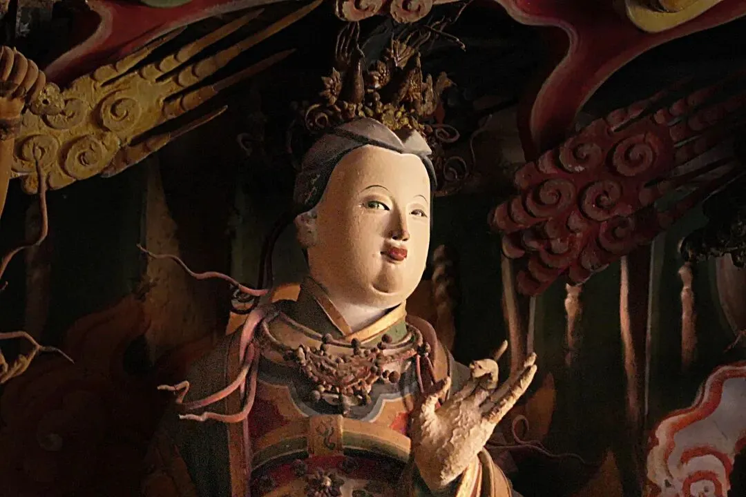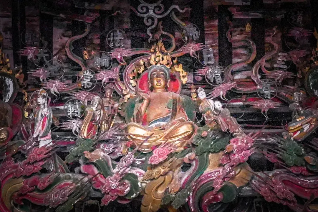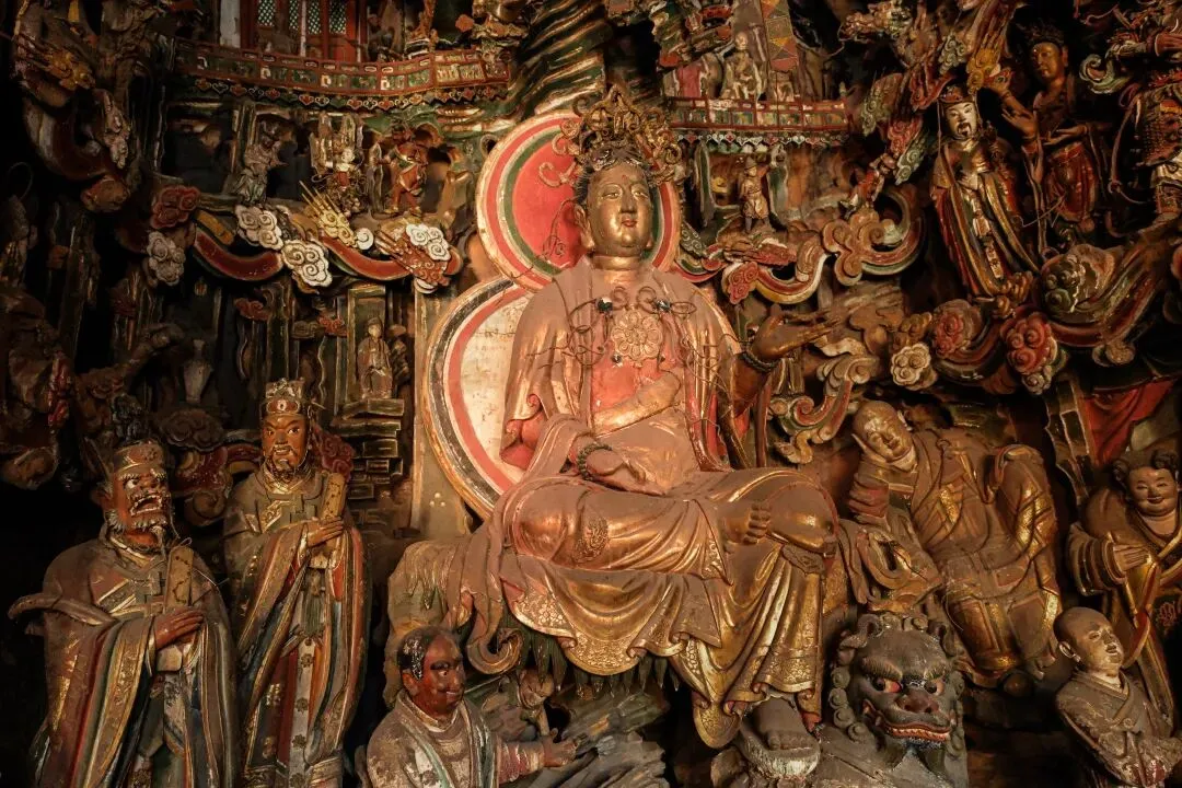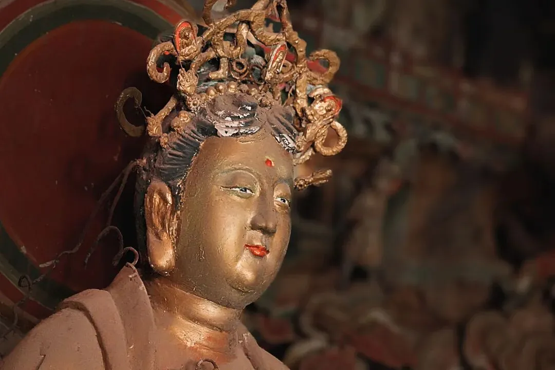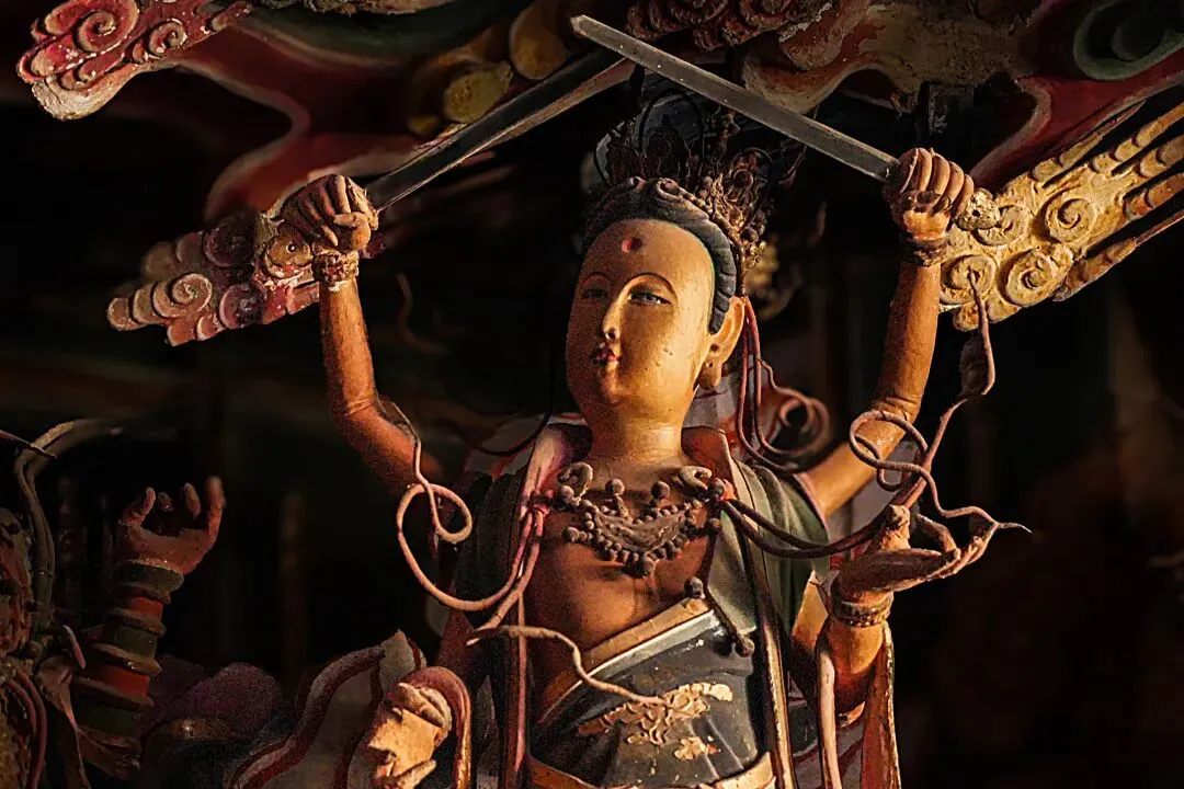 观音殿塑像以矿物颜料彩绘,历经四百余年仍色泽艳丽,被誉为“海内悬塑之冠”和“明代悬塑珍品”。其造型细腻生动,如“千手观音”悬塑百余只手姿态各异,童子像发丝纤毫毕现,展现明代雕塑巅峰技艺。