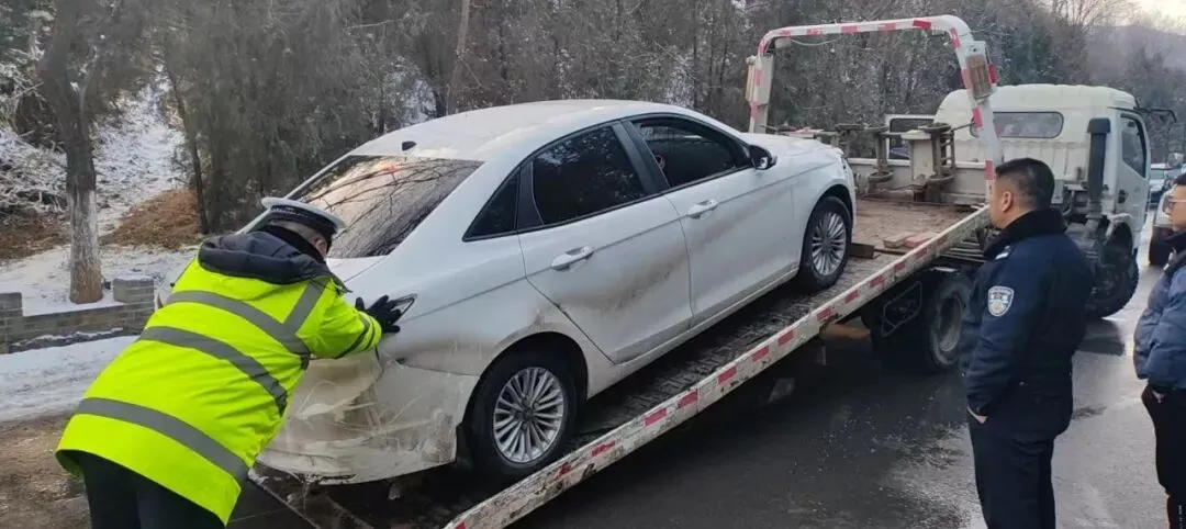 1月1日下午,平顺县公安局交通管理大队五中队民警在325省道开展巡逻保畅工作时,发现一辆白色小轿车因雪天路滑,不慎撞上路边护栏后滑下路基,车辆受损严重,所幸未造成人员受伤。