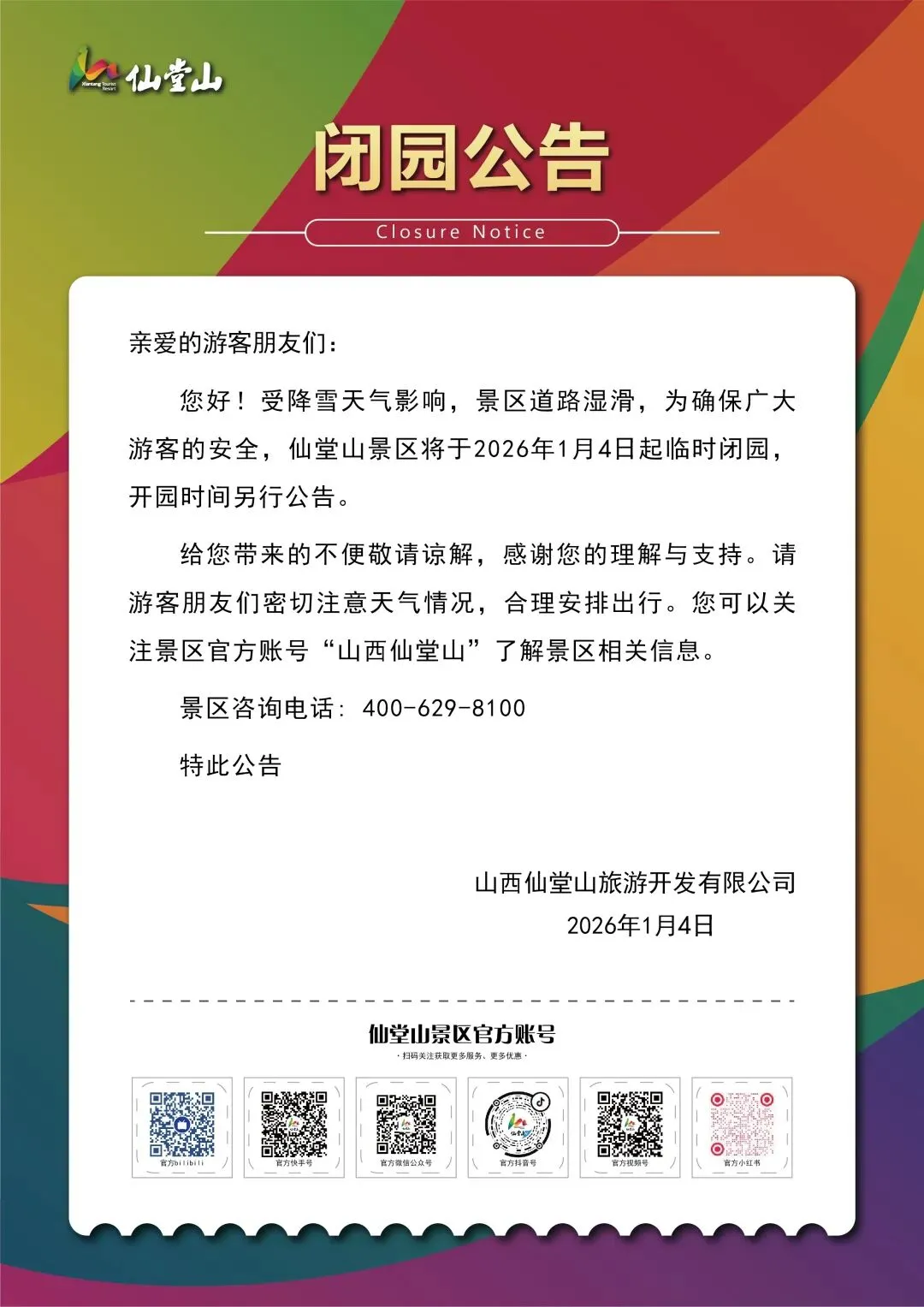 您好!首先衷心感谢大家长期以来对本景区的关注与支持。由于强降雪天气影响,景区内山路积雪深厚、路面结冰严重,且积雪清理作业受山区复杂地形限制难以快速完成,目前已不具备安全游览条件。为切实保障广大游客的人身安全,经景区管理部门综合研判并慎重决定:自2026年1月4日起至2026年1月5日止,景区实行临时闭园管理。闭园期间,景区将实行封闭管理,严禁任何游客未经许可擅自进入景区区域,以免因道路积雪、结冰或突发天气引发安全事故,擅自进入者需自行承担全部人身及财产安全风险。