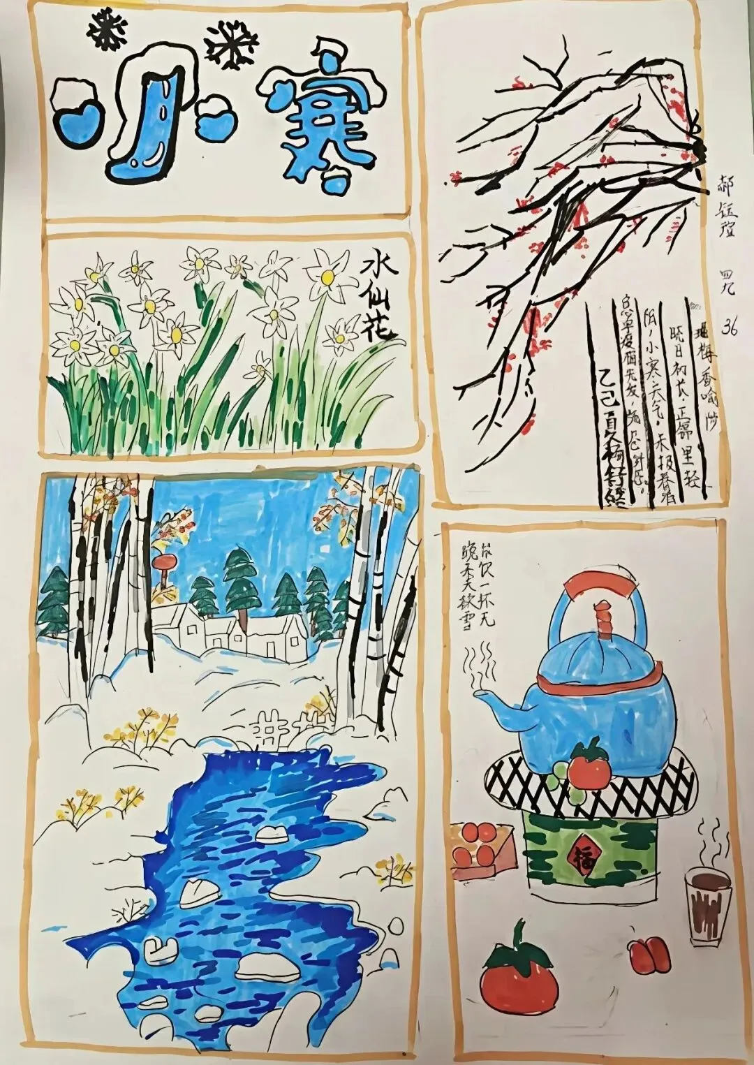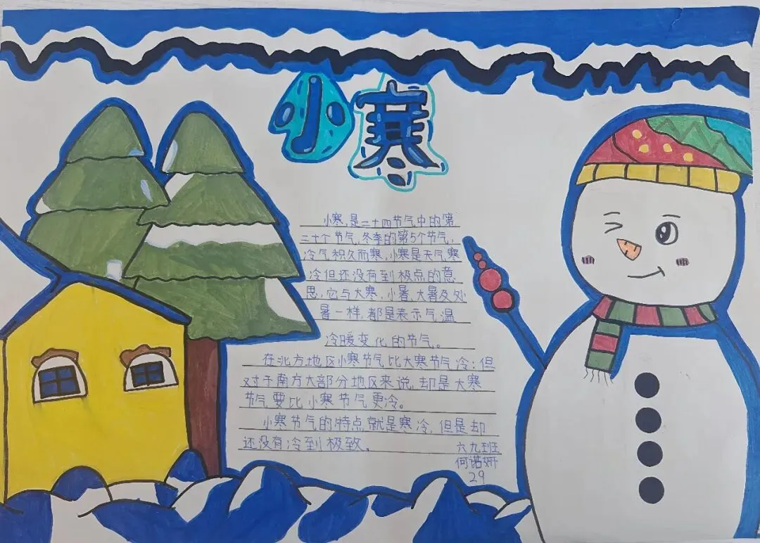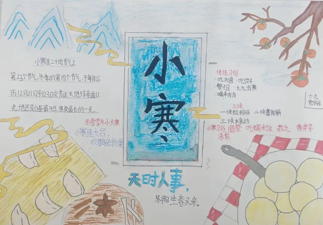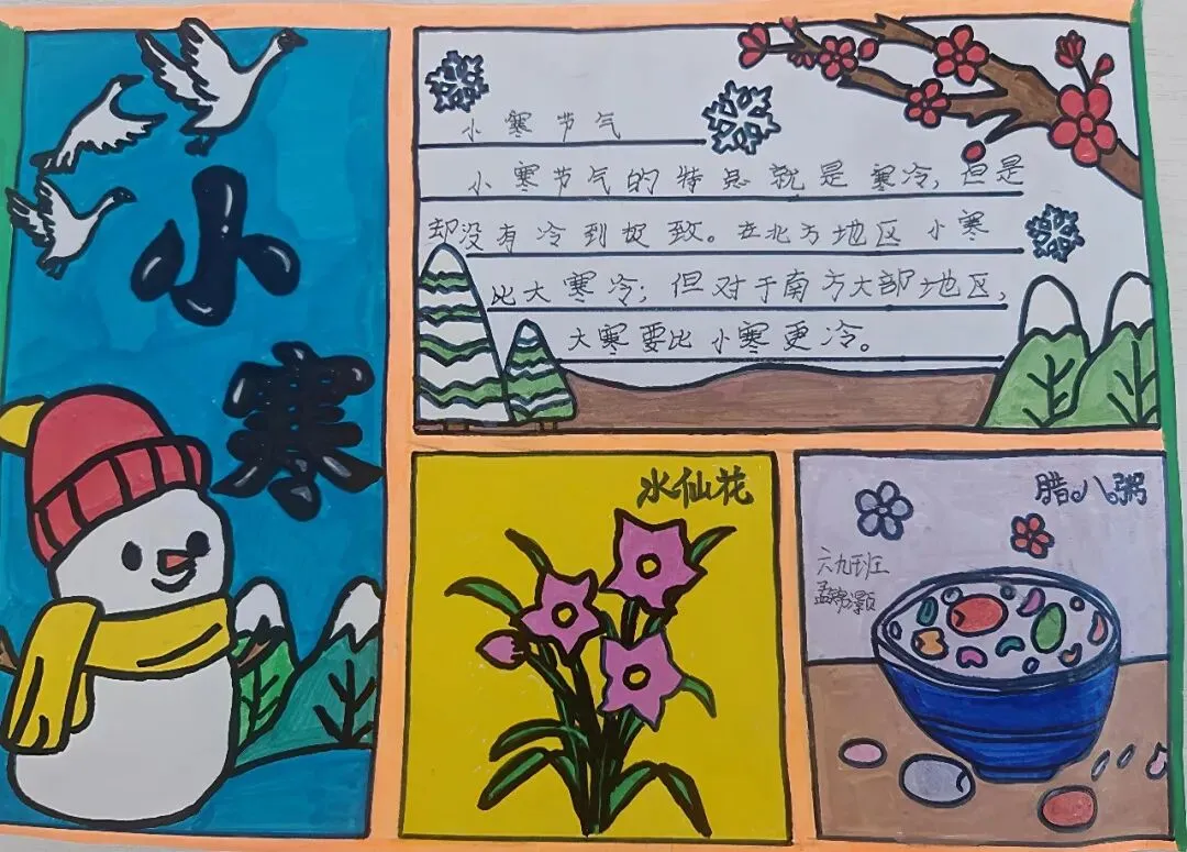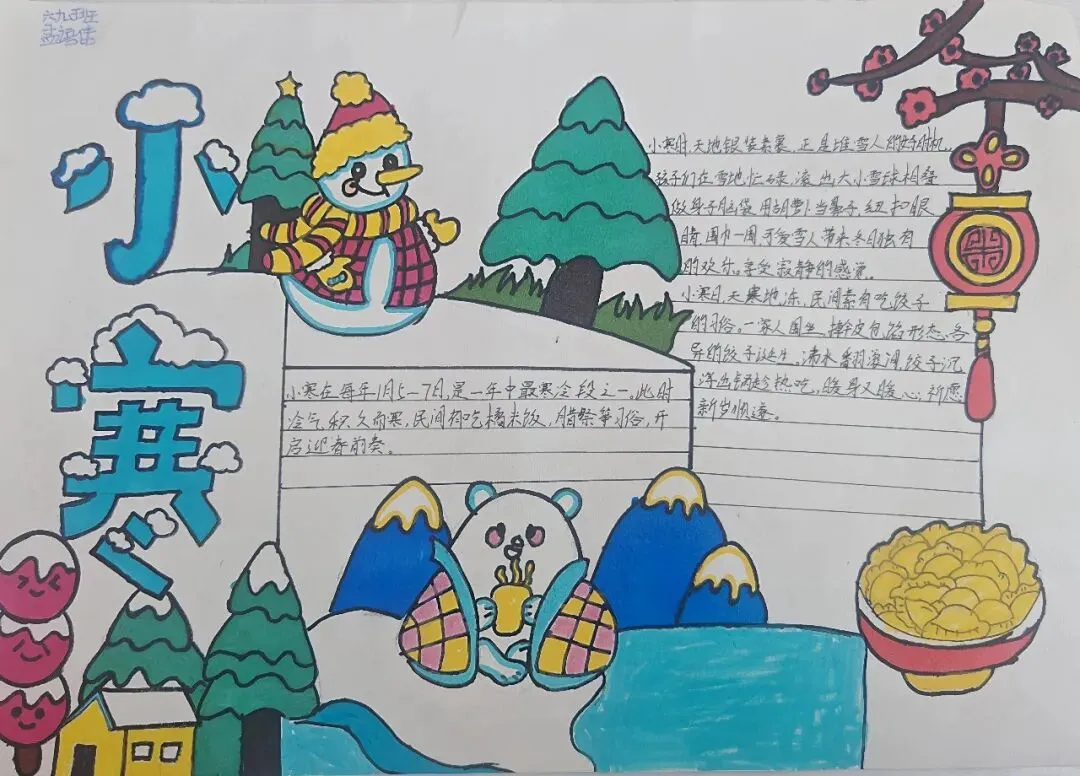 一纸一笔,绘不尽冬日风情。手抄报创作活动中,同学们化身小小设计师,将小寒的节气知识、民俗习惯、诗词谚语融入斑斓的色彩与精巧的排版中。一幅幅作品图文并茂、创意十足,不仅展现了同学们的巧手慧心,更让传统文化在笔尖流淌。