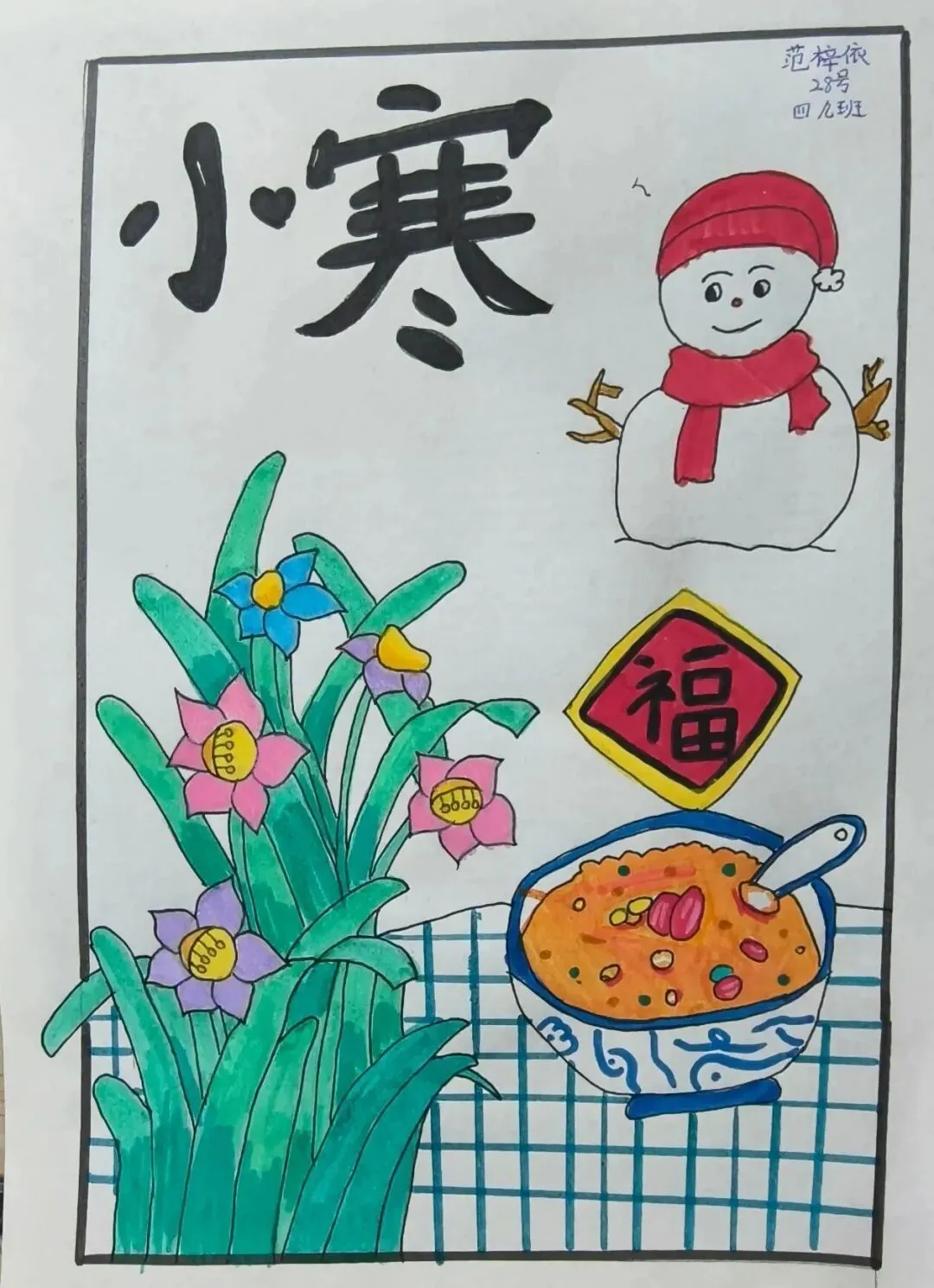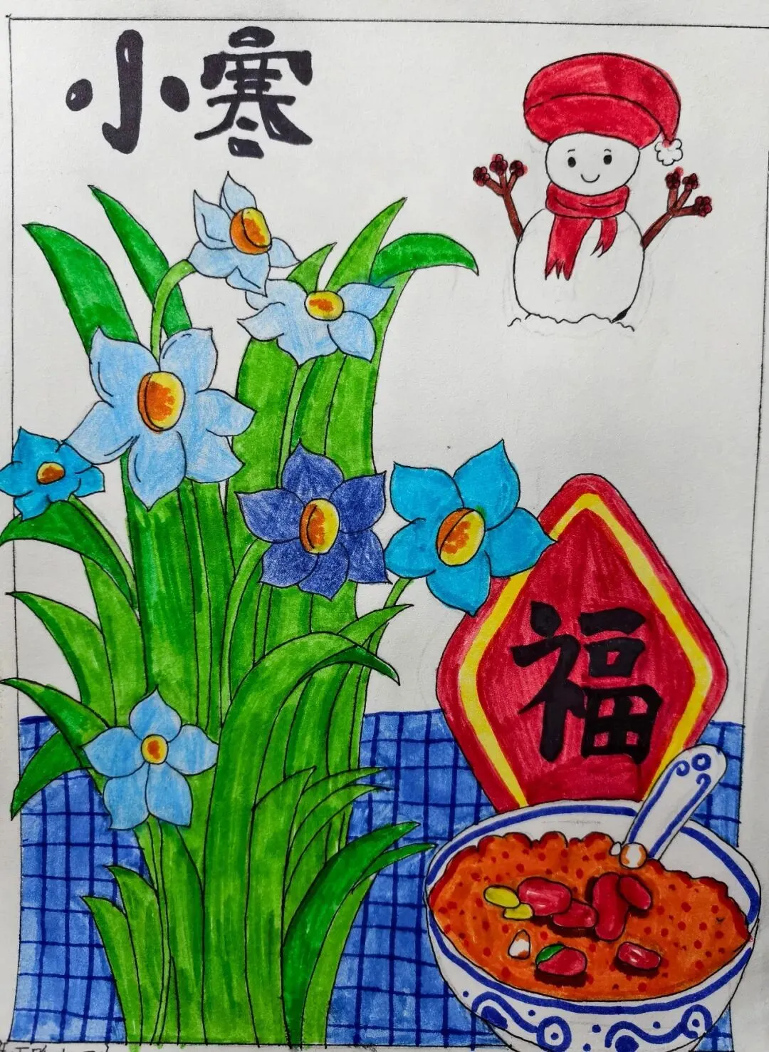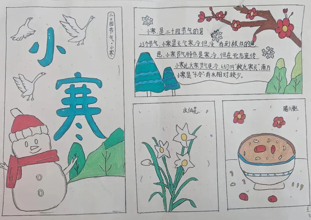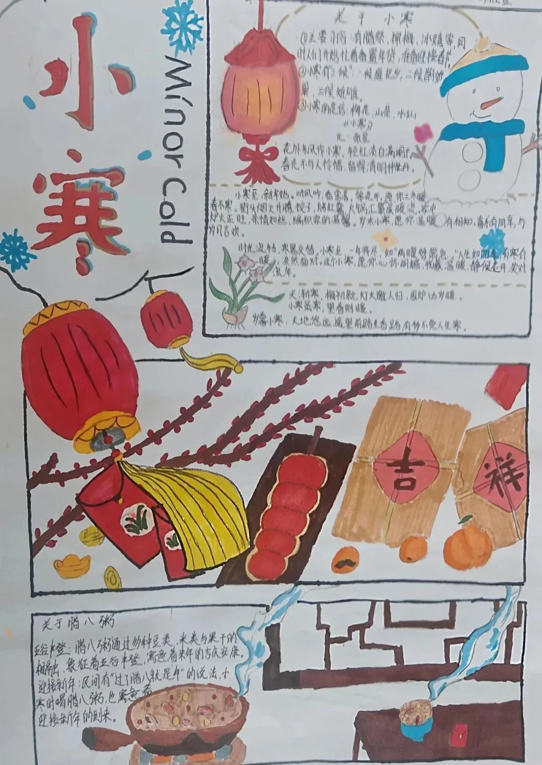 一纸一笔,绘不尽冬日风情。手抄报创作活动中,同学们化身小小设计师,将小寒的节气知识、民俗习惯、诗词谚语融入斑斓的色彩与精巧的排版中。一幅幅作品图文并茂、创意十足,不仅展现了同学们的巧手慧心,更让传统文化在笔尖流淌。