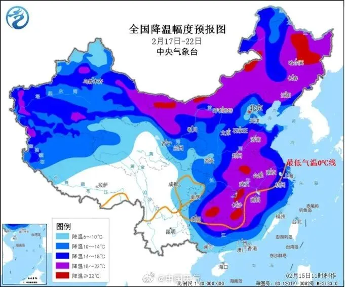中央气象台预计,2月17日至22日寒潮天气将影响我国,将造成:
