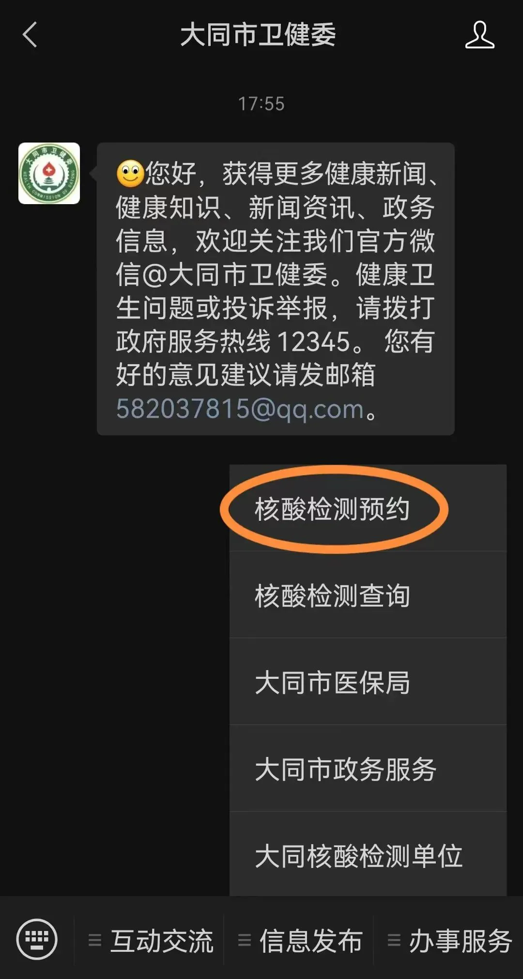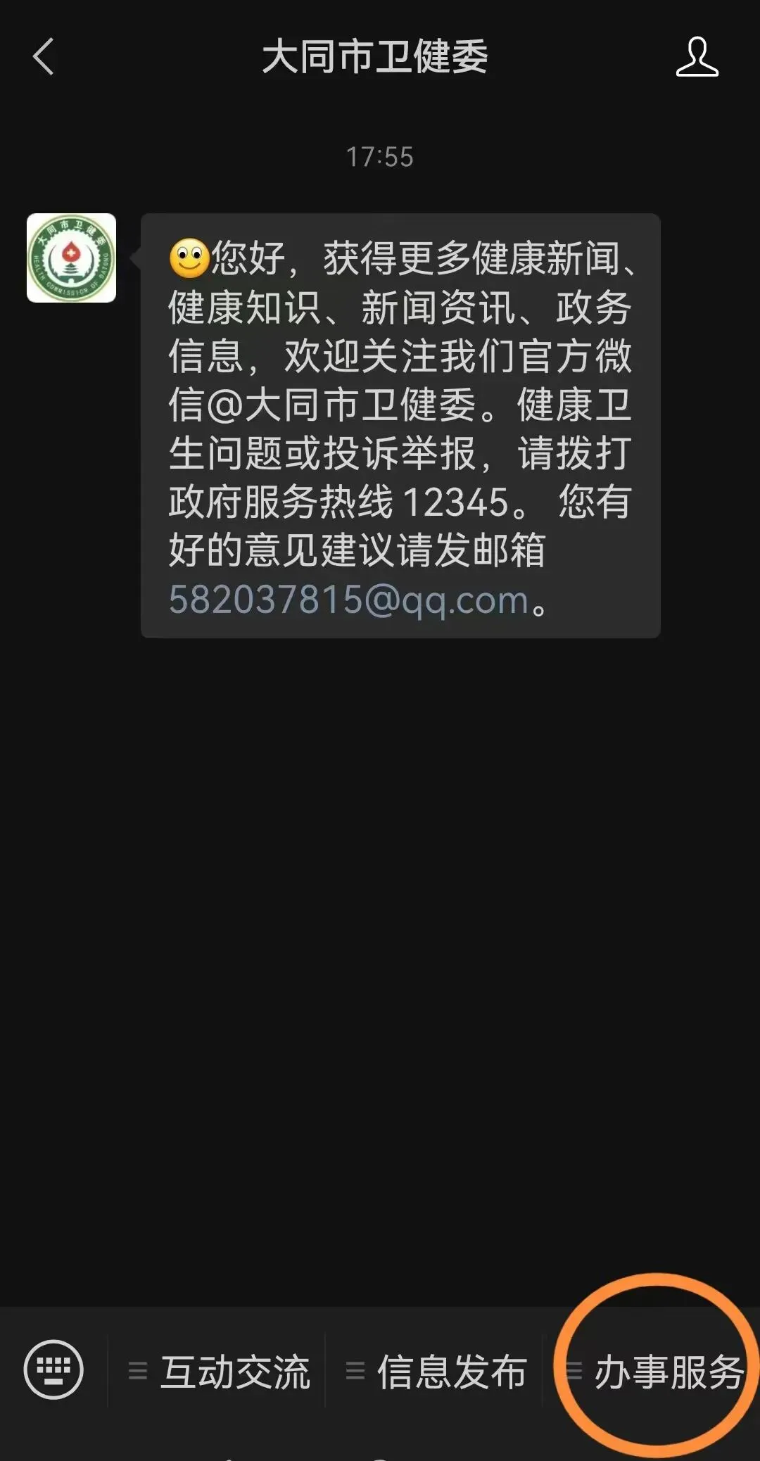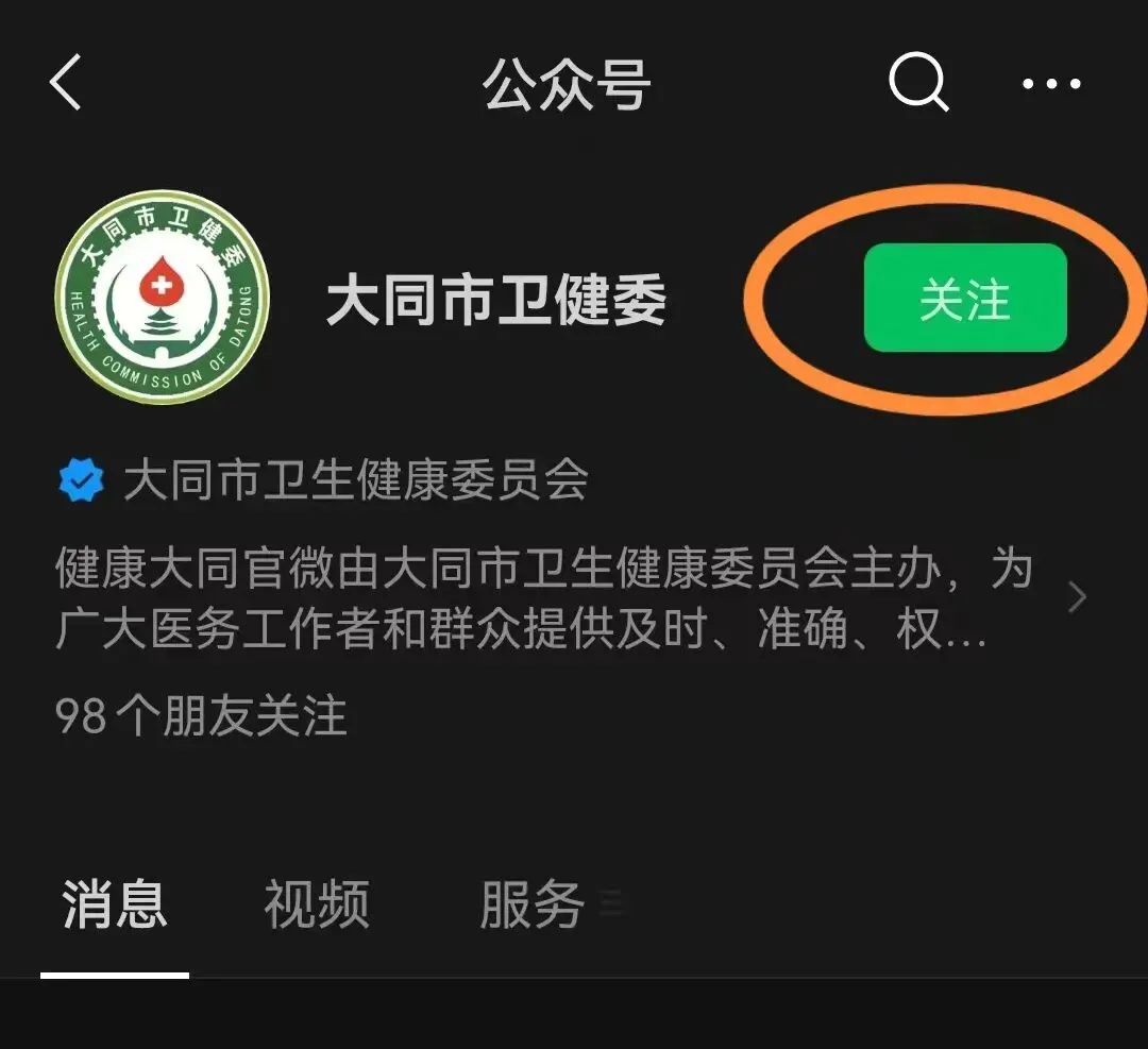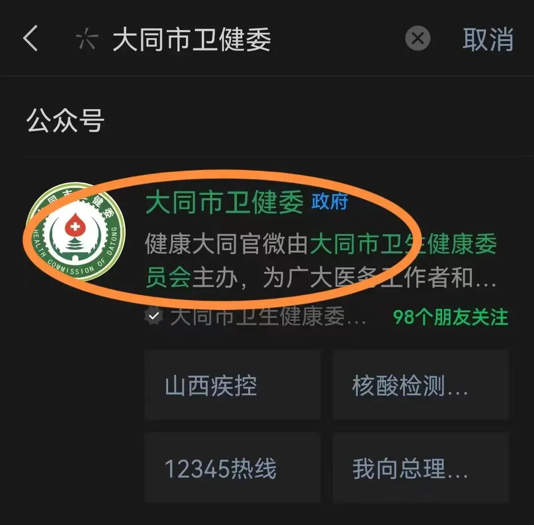 1、通过微信搜索“大同市卫健委”微信公众号;