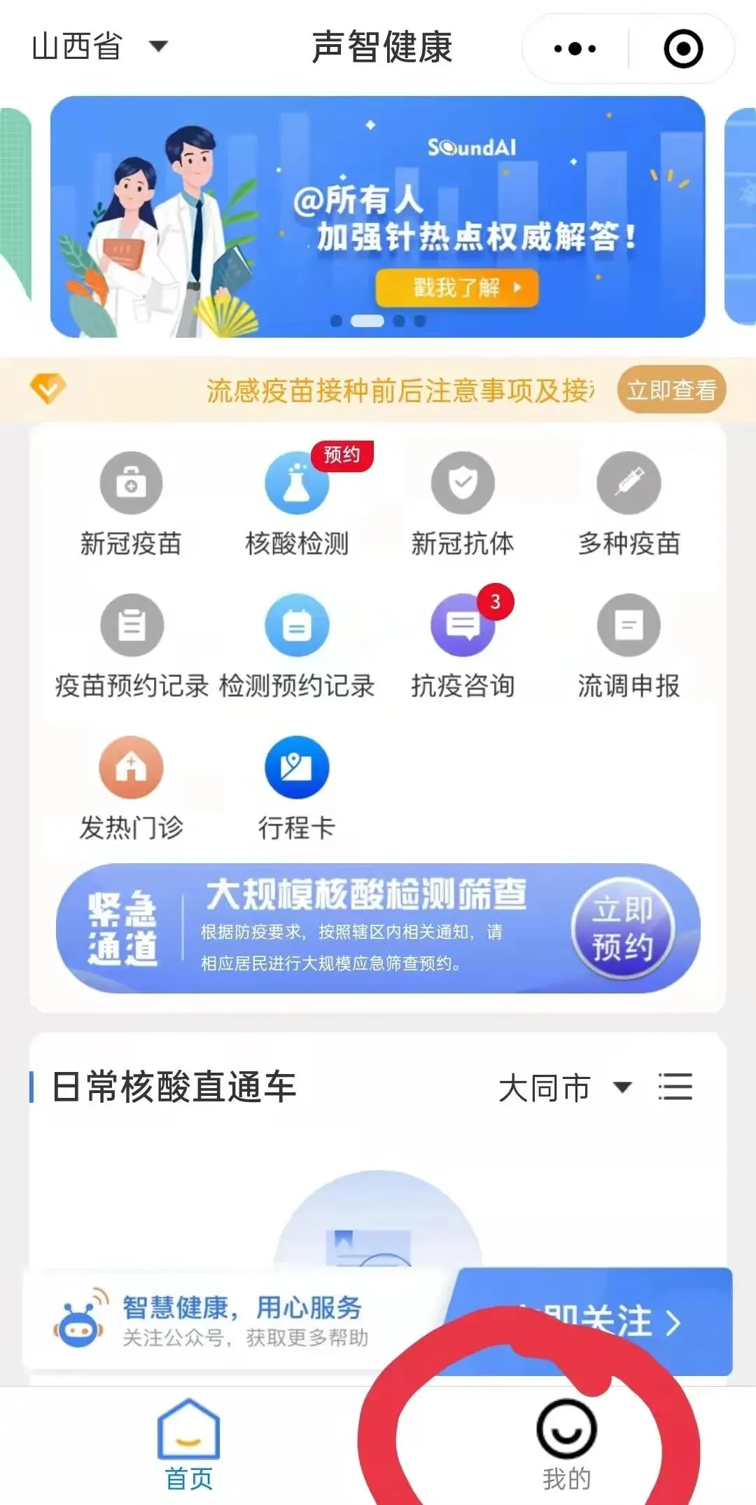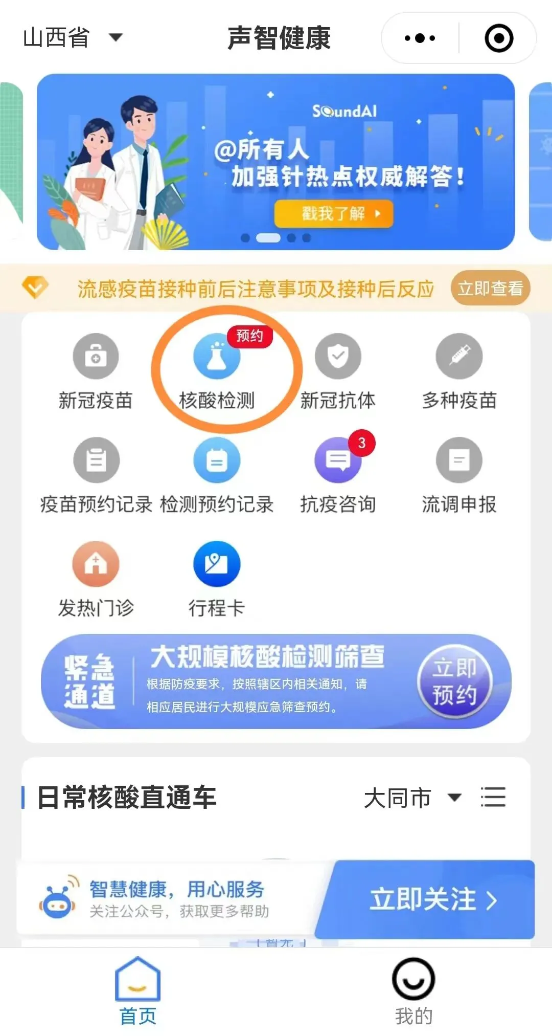 1、在进入核酸检测预约页面,点击头像上方的图标,进入“声智健康”页面;