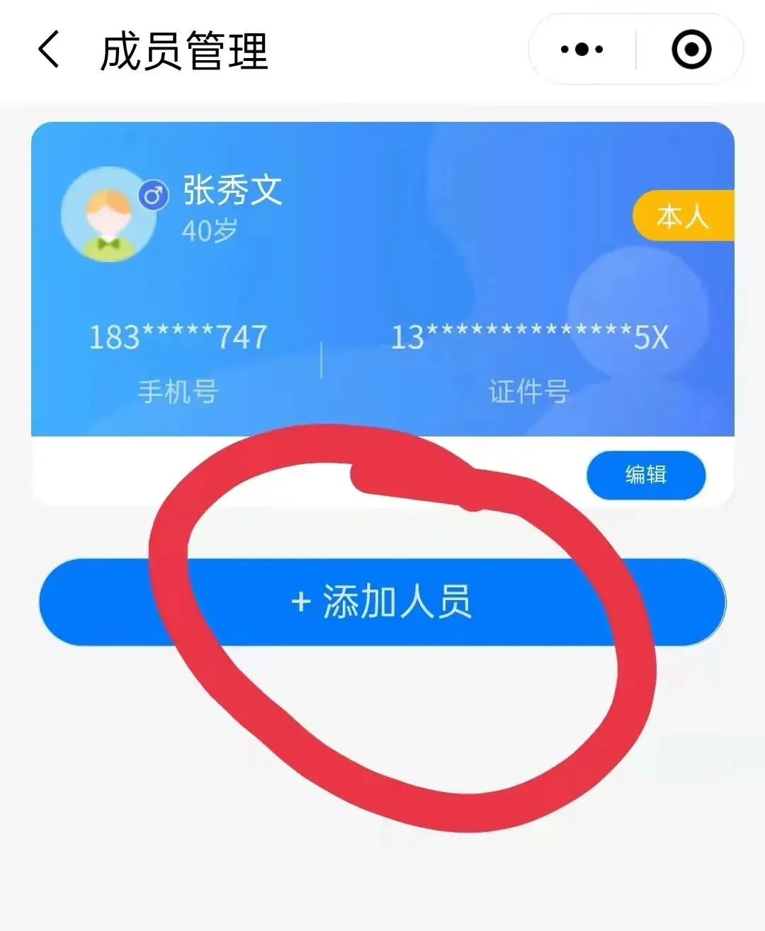 3、接着点击“成员管理”进入成员管理页面就可添加人员,代他人填写好信息后即可进行预约。
