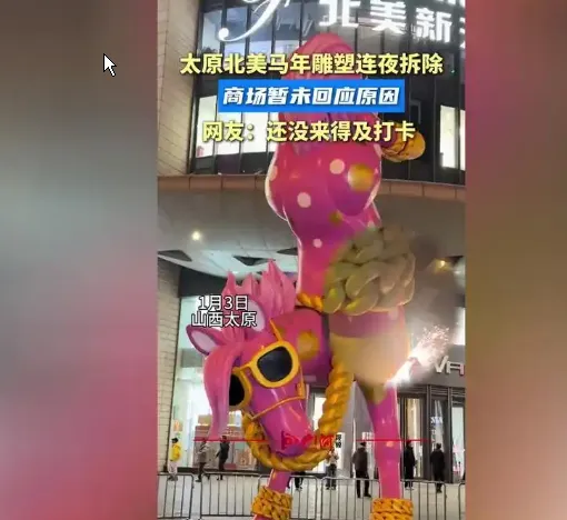 2026年1月3日深夜,位于太原北美购物中心的雕塑“马年”悄然消失。没有任何公告,没有任何解释,只留下空荡荡的底座和社交媒体上流传的各种疑问。这座于2014年落成的节日装置曾是热门的拍照打卡点,如今却消失得无影无踪。公众不知道它是否会被替换,也不知道是否已经获得授权。