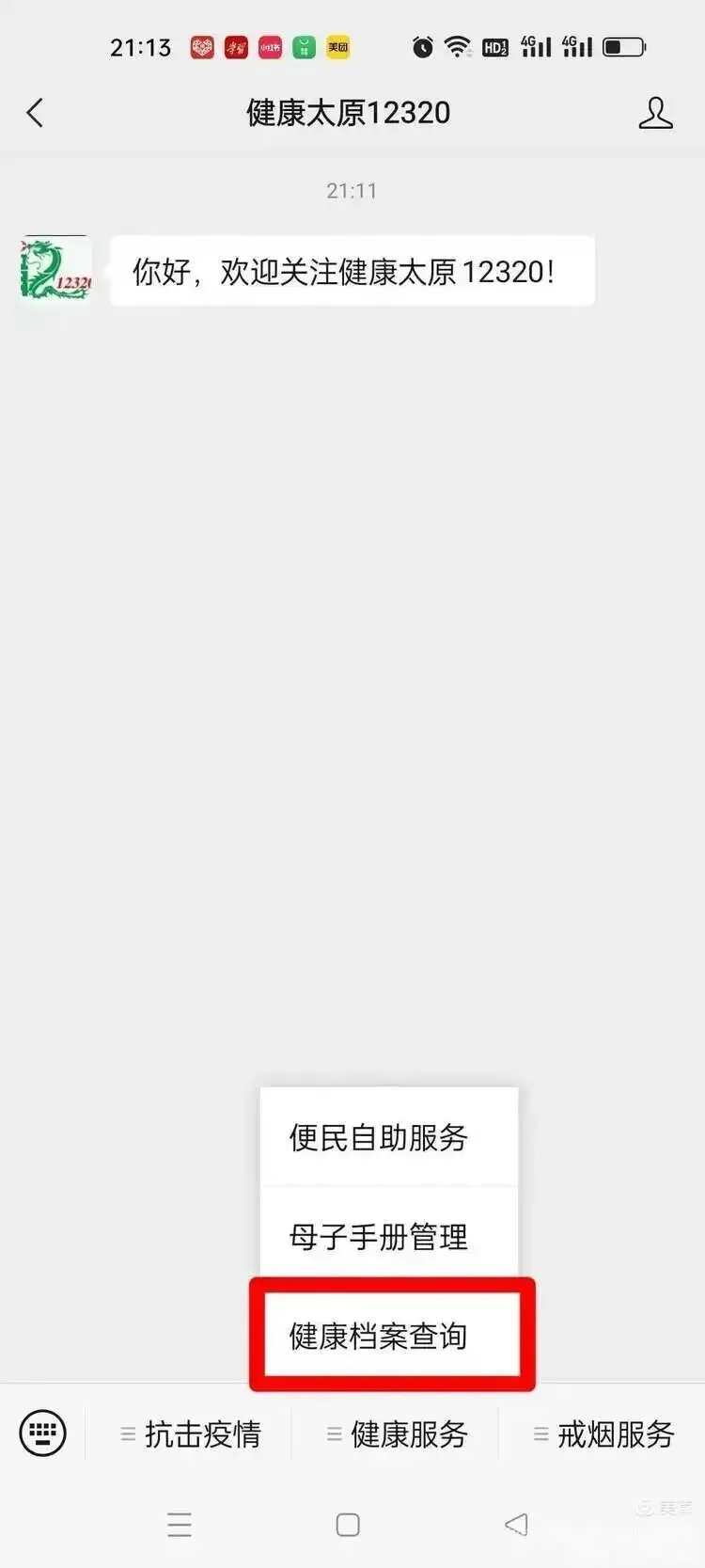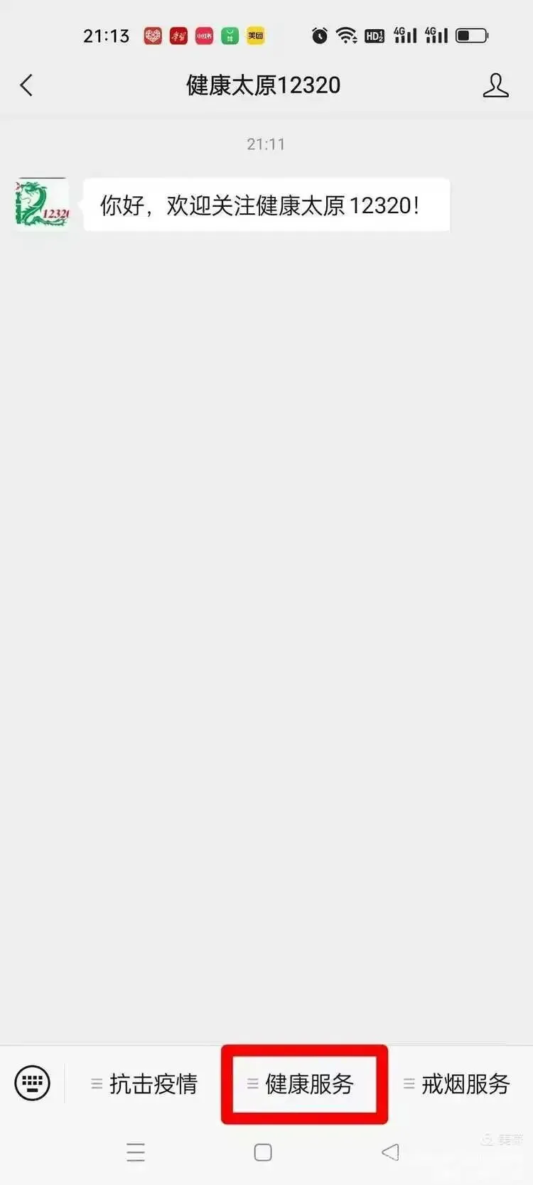 1,打开微信,单击“通讯录---公众号”,搜索“健康太原12320”,并关注此公众号。