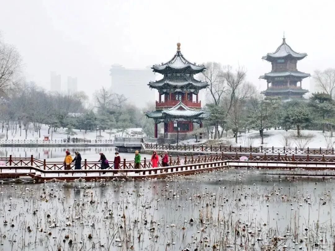 白,是迎泽冬日最本真的底色,藏着纯粹与静谧,却在素净中晕染出万千韵味。这份白,先凝于晨霜,再覆于寒雪,为迎泽的天地描上一层清透的轮廓。清晨的迎泽公园,草木枝桠间凝着薄霜,在晨光中泛着莹白微光。若逢一场大雪,整座公园便换了模样,松柏的苍翠被白雪轻覆,枝桠坠着蓬松的雪团,脚下的石板路积着薄薄一层白,踩上去发出“咯吱”的轻响,与远处亭台的飞檐翘角相映,一步一景皆是诗画。