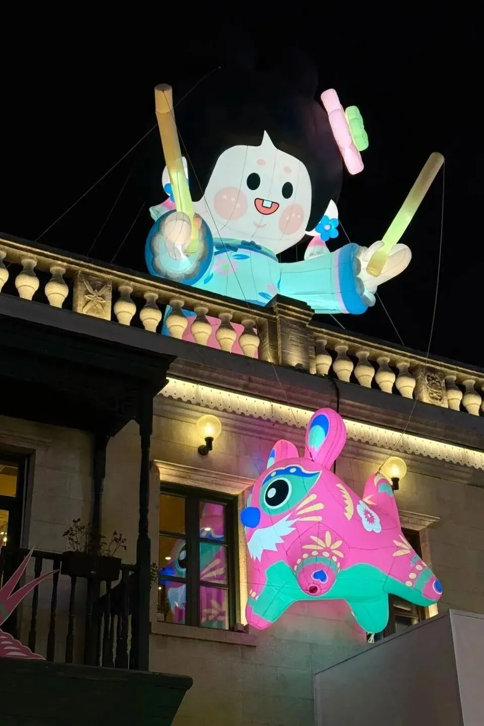 这里的夜是流动的色彩盛宴。流光羽翼造型的灯组舒展着柔和光晕;戏剧造型的“钟宝儿”身着彩衣,眉眼灵动似从晋剧里走来;憨态可掬的“hi虎”带着喜庆底色......各种元素与色彩相互碰撞又莫名和谐,这抹包容万象的黑,藏着比白昼更浓郁的热闹与温情,让迎泽的冬夜满是鲜活韵味。