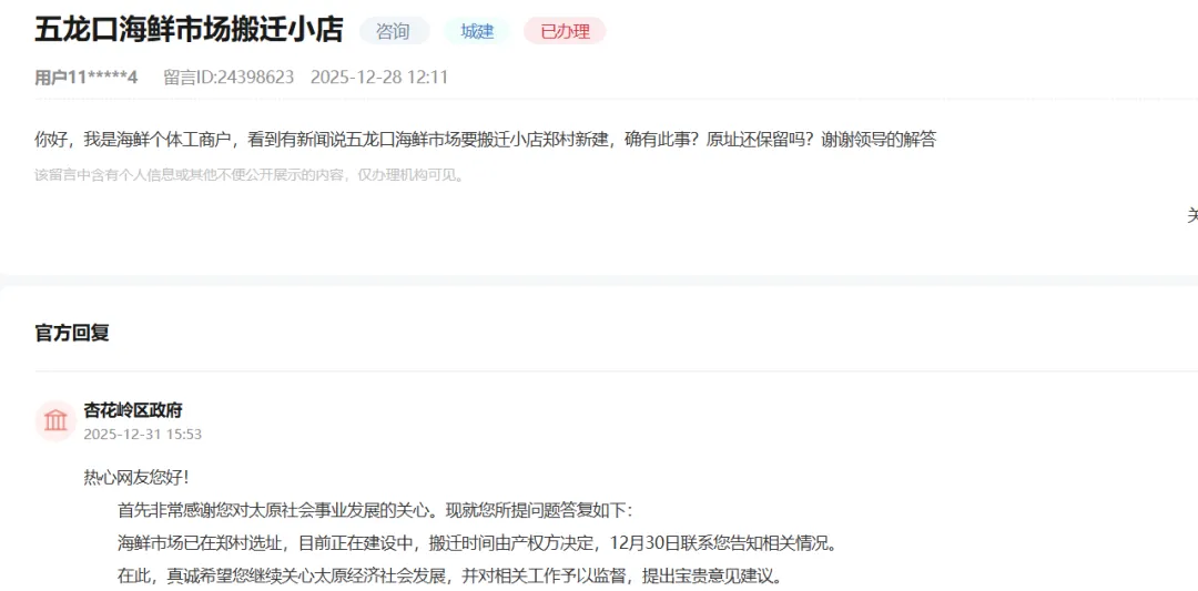 太原:五龙口海鲜市场搬迁小店?官方回复!