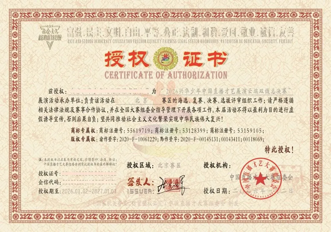 中国直播才艺大赛组委会拥有“兴华少年”品牌商标及知识产权的全部使用权、所有权;“兴华少年”组词释意:“兴”为“振兴、复兴”的含义,而“华”为“中华”代表的正是“中华民族”,“兴华”含义为“振兴中华民族”,“少年”泛指代表青少年人群,是祖国的未来、民族的希望。“兴华少年”整体含义为“振兴中华民族的希望”;中国直播才艺大赛也对“全国青少年”寄予厚望,希望他们自力更生、艰苦奋斗,振兴中华民族,让中华民族重回世界之巅,兴华少年充满了拳拳爱国之情,是对当代青少年爱国精神为主题的一种表现形式。