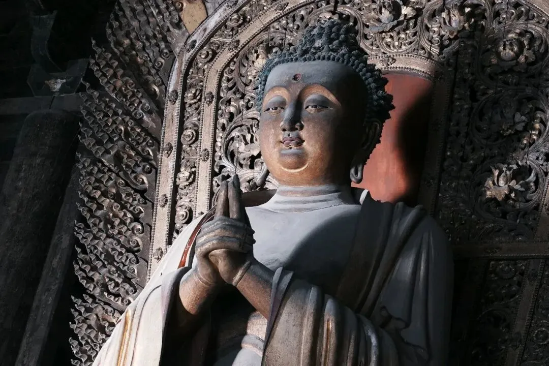 更加幸运的是,在大雄宝殿,我看见阳光一点点移到到五方佛中中央毗卢遮那佛和东方阿閦佛面部,这两尊金代彩塑面部在阳光的映射下,更显得庄严慈悲。
