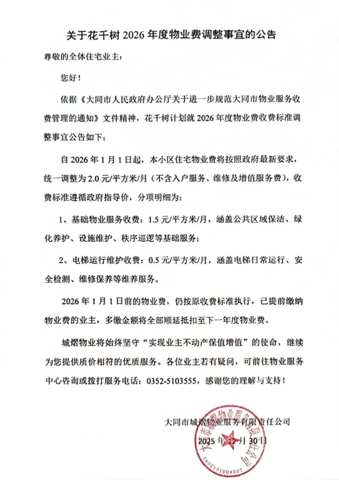 大同:2家小区物业费调整公告!