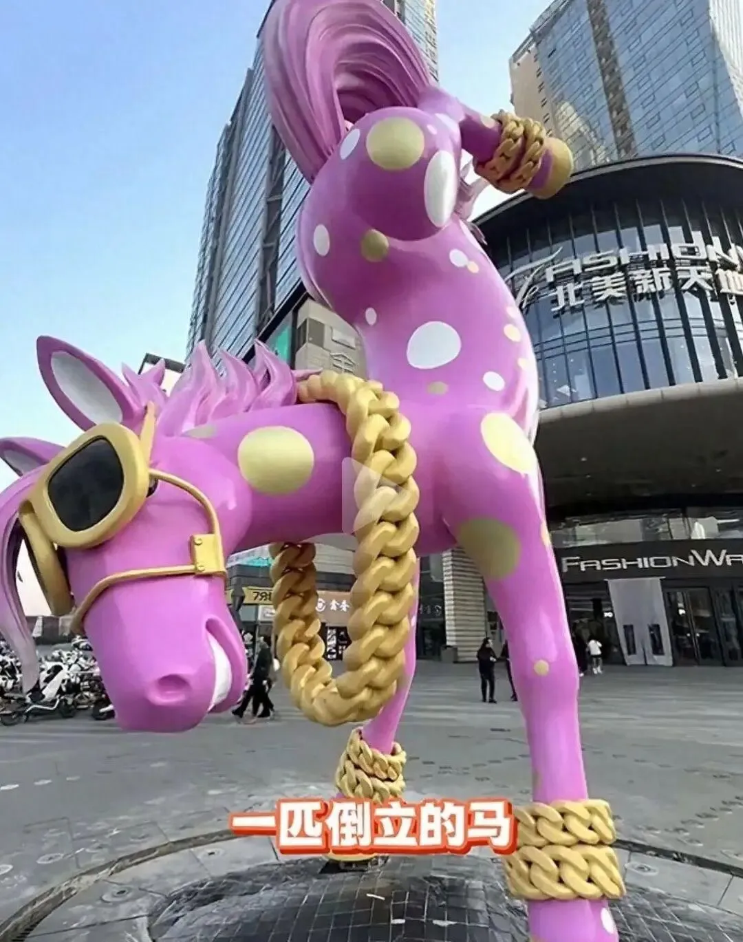 几天前,为迎接即将到来的农历马年,太原北美新天地商场在入口处设置了一座倒立的马形雕塑。设计初衷是借助谐音表达“马到成功”、“马上发财”的美好寓意,乍一听颇具巧思。
