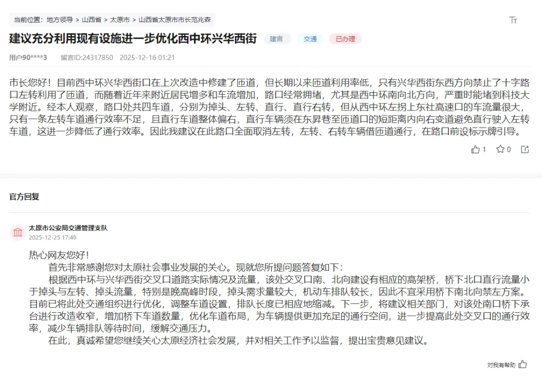 对于市民建议官方回复称:根据西中环与兴华西街交叉口道路实际情况及流量,该处交叉口南、北向建设有相应的高架桥,桥下北口直行流量小于掉头与左转、掉头流量,特别是晚高峰时段,掉头需求量较大,机动车排队较长,因此不宜采用桥下南北向禁左方案。