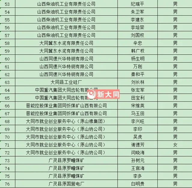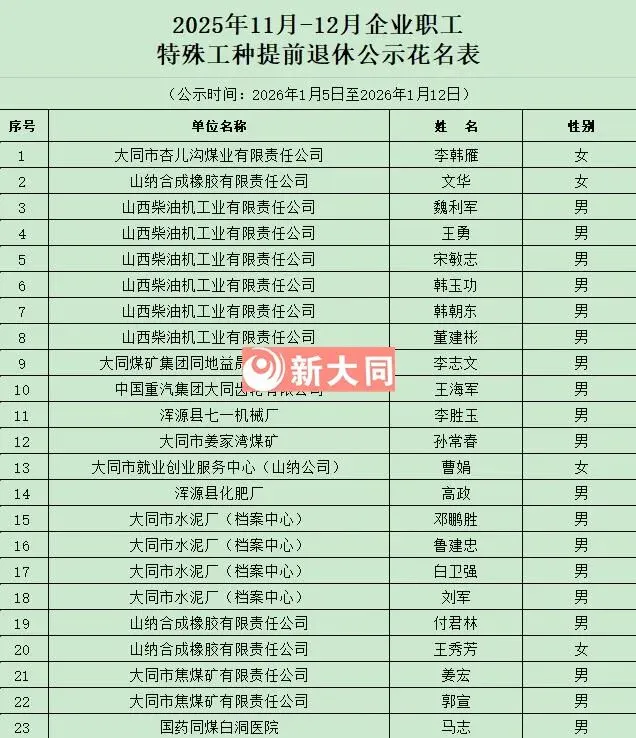 2025年大同市11月-12月特殊工种拟办理退休人员名单网上公示