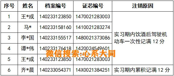 广大机动车驾驶人:根据《机动车驾驶证申领和使用规定》第八十条规定,以下6名驾驶员在实习期内、实习期届满后处理实习期间发生的违法行为记满12分。现公示驾驶员信息,请及时前往车管所核实信息并注销驾驶证。机动车驾驶人未在规定期限(三十日)内申请注销驾驶证的,公安交通管理综合应用平台系统将自动注销其驾驶证,来源:大同交警