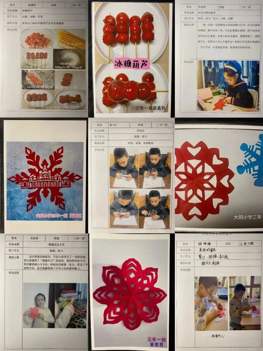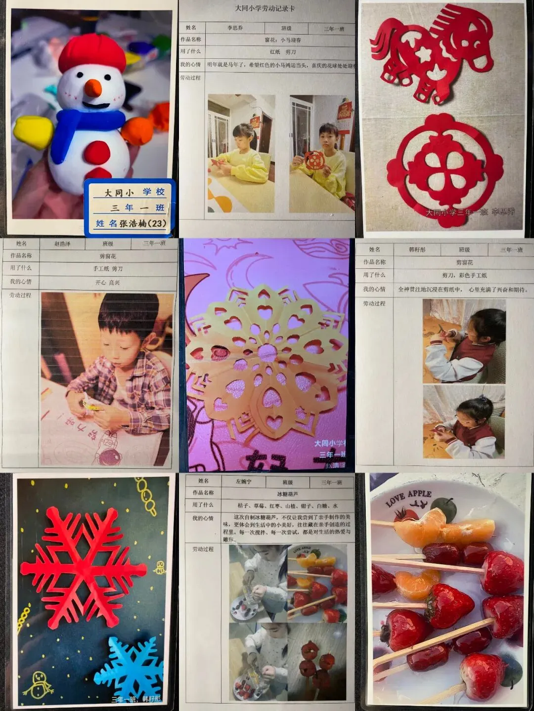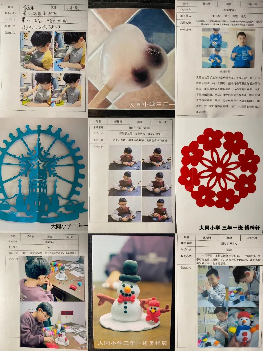 从晶莹剔透的自制冰灯、憨态可掬的彩泥小人,到充满巧思的彩泥冰雪场景;从年味十足的冰雪窗花、灵动秀美的剪纸作品,到酸甜可口的手工冰糖葫芦、清爽有趣的自制冰棍……孩子们根据兴趣自主挑选任务,全身心的投入让冰雪劳动变得鲜活又有趣。