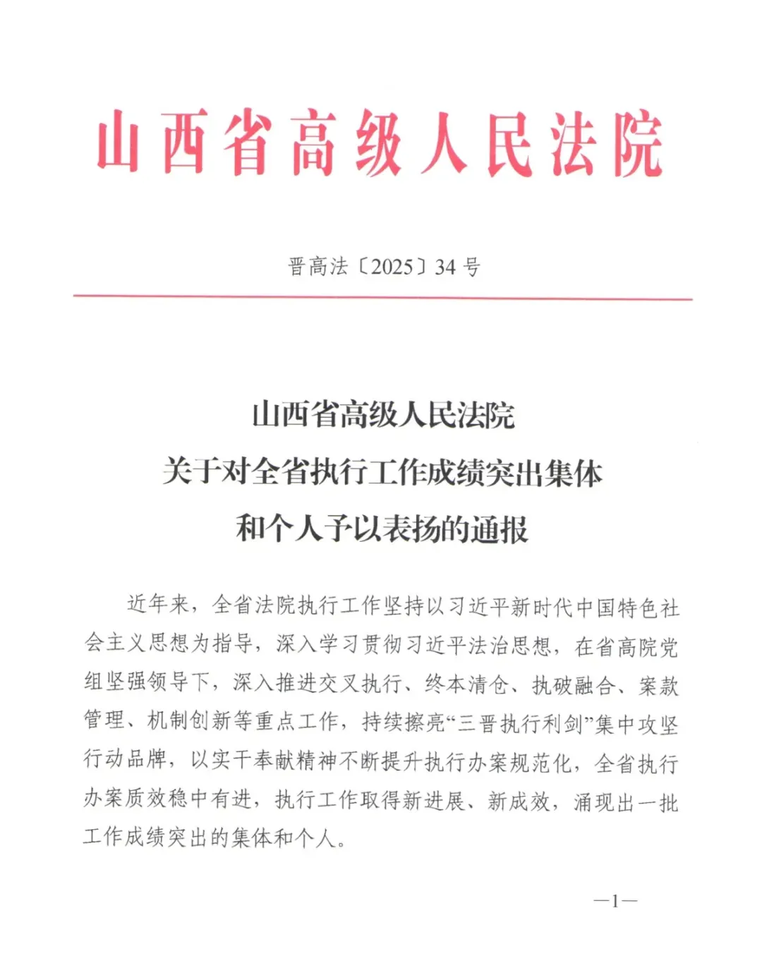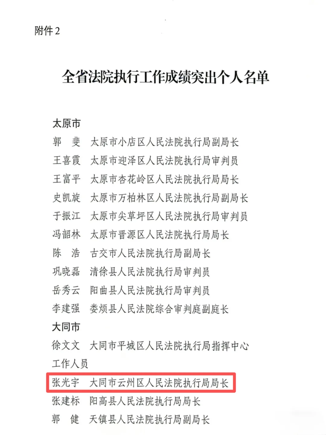 为充分调动干警履职热情,推动工作提质增效,积极营造对标先进、奋勇争先的浓厚氛围,山西省高级人民法院决定,对全省法院20个集体、80名个人予以通报表扬。其中,大同市云州区人民法院执行局局长张光宇获评“全省法院执行工作成绩突出个人”。