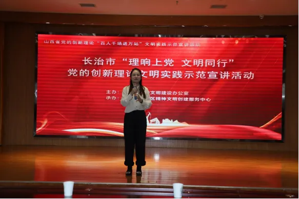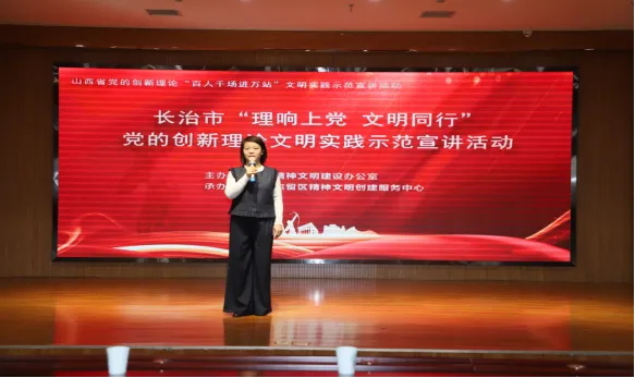 长治日报社特邀宣讲员郜盼,以《太行回响》为题,讲述了抗战期间,革命先辈的孩子被寄养在太行老区,以武巧凤为代表的奶娘们,在艰苦环境中,不惜牺牲生命守护八路军后代的故事。她们是无数太行儿女乃至中华儿女的缩影,彰显了军民同心抗敌的伟大精神。通过宣讲,旨在传承红色基因,召唤精神力量。
