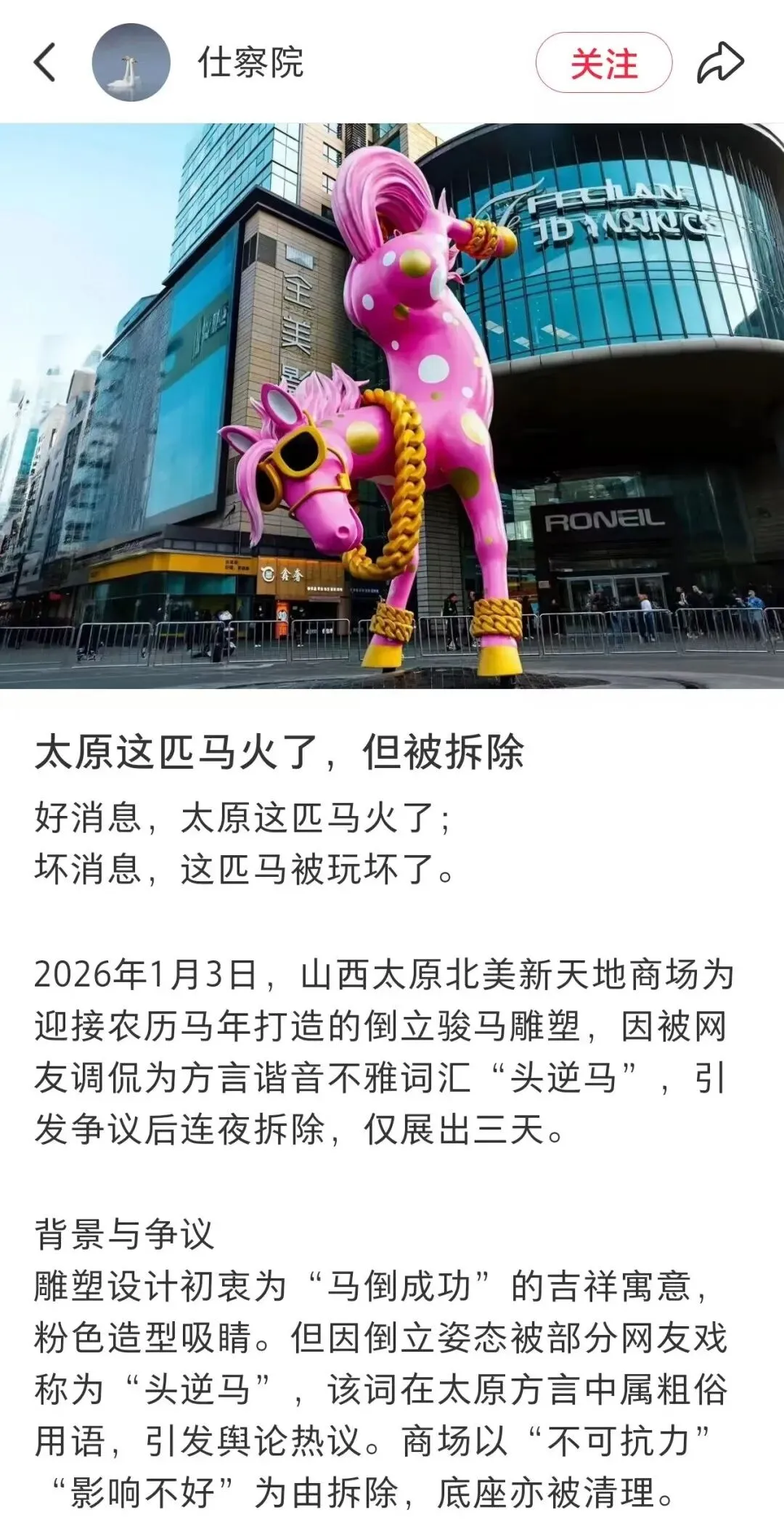 我当时看到新闻的时候也是一脸懵,非常认真甚至挑剔地看了小马的各个角度。第一反应是好可爱、欢脱的小马。但是转念又想,如果是拆了,肯定是有什么问题,然后就拼命发挥了想象力,难道是后腿扬这么高是因为前面有阻碍来了个急刹车么?觉得寓意不好?
