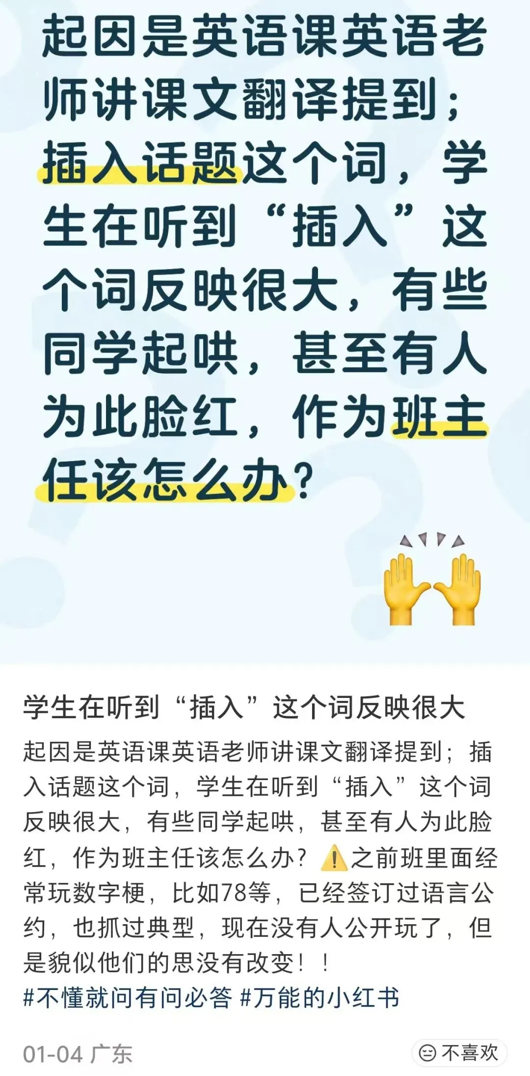 我忽然想到了前两天在小红书上看到的一篇笔记。一个老师求助:上课的时候说“插入”,被同学们起哄。
