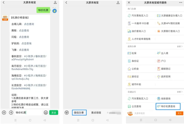 扫描下方二维码,关注【太原本地宝】公众号,回复【特价机票】关键词或者在菜单栏点击【微信办事】即可快速直达查询入口,获取更多平台入口进行比价