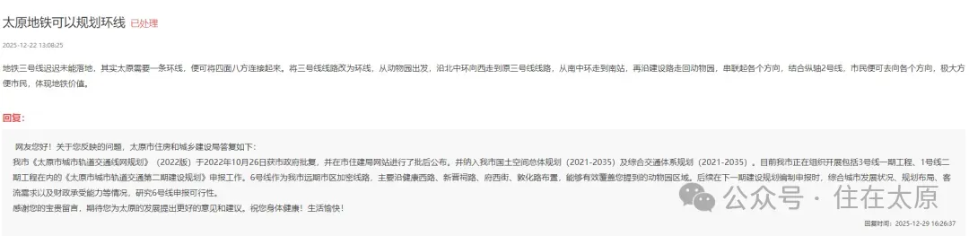 市民建议太原地铁3号线改为环线!官方回复来了...